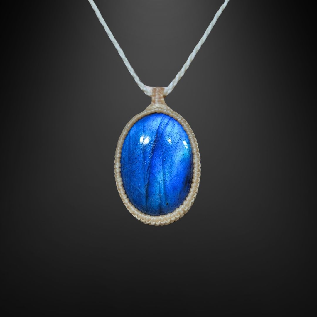 輝くラブラドライトを使用したこの美しいマクラメペンダントは、