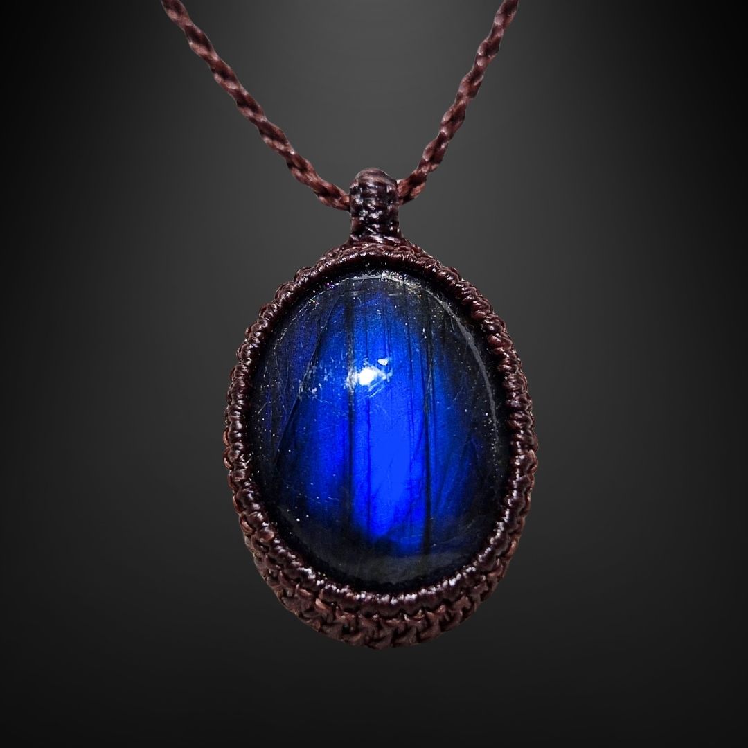 輝くラブラドライトを使用したこの美しいマクラメペンダントは、