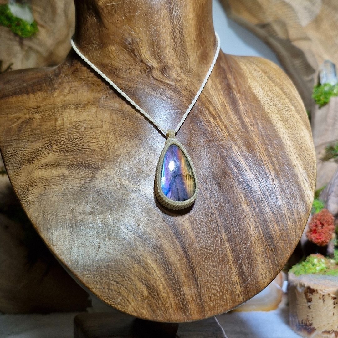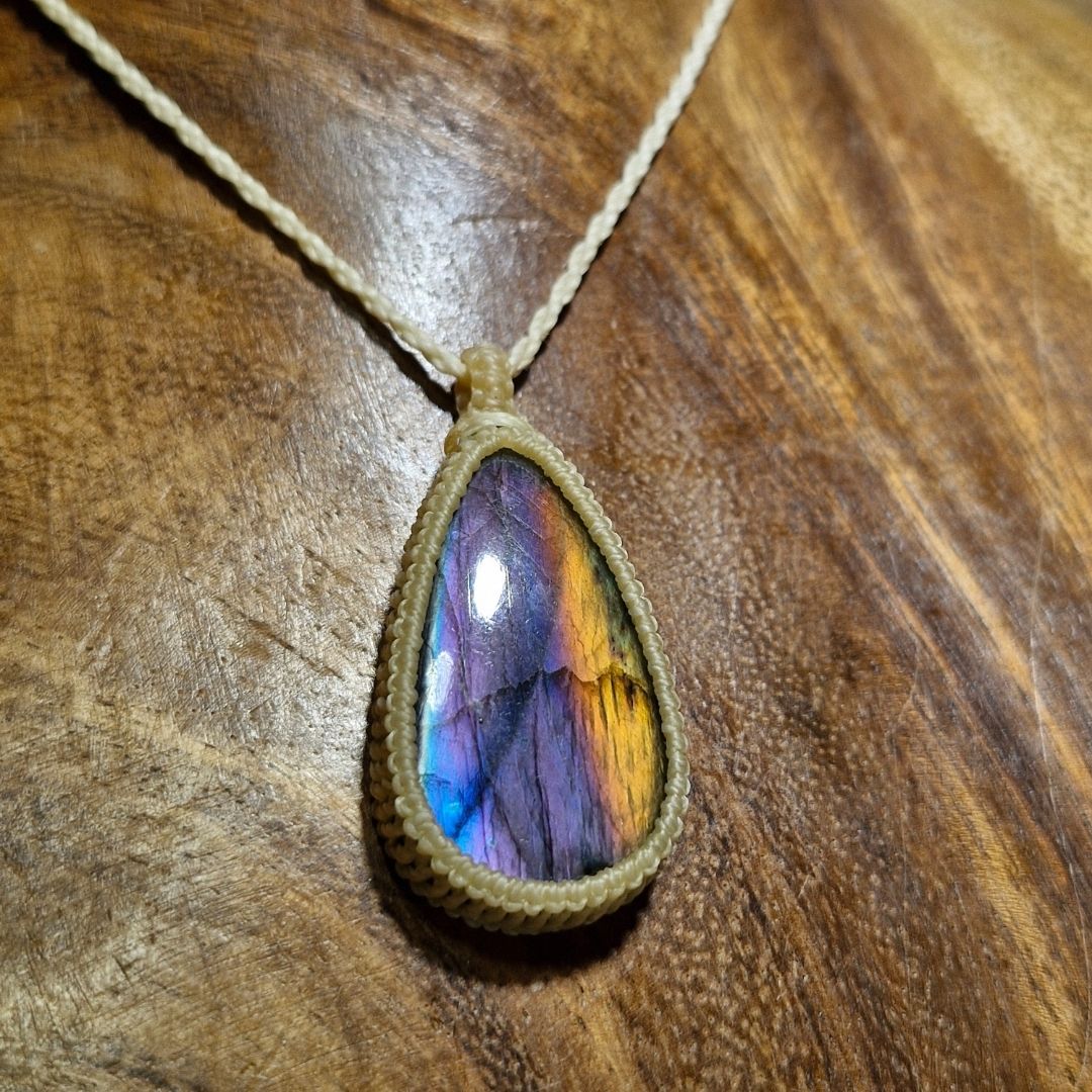 輝くラブラドライトを使用したこの美しいマクラメペンダントは、