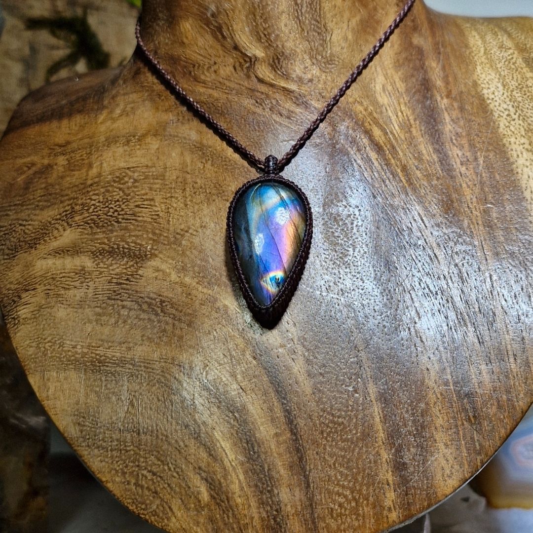 輝くラブラドライトを使用したこの美しいマクラメペンダントは、