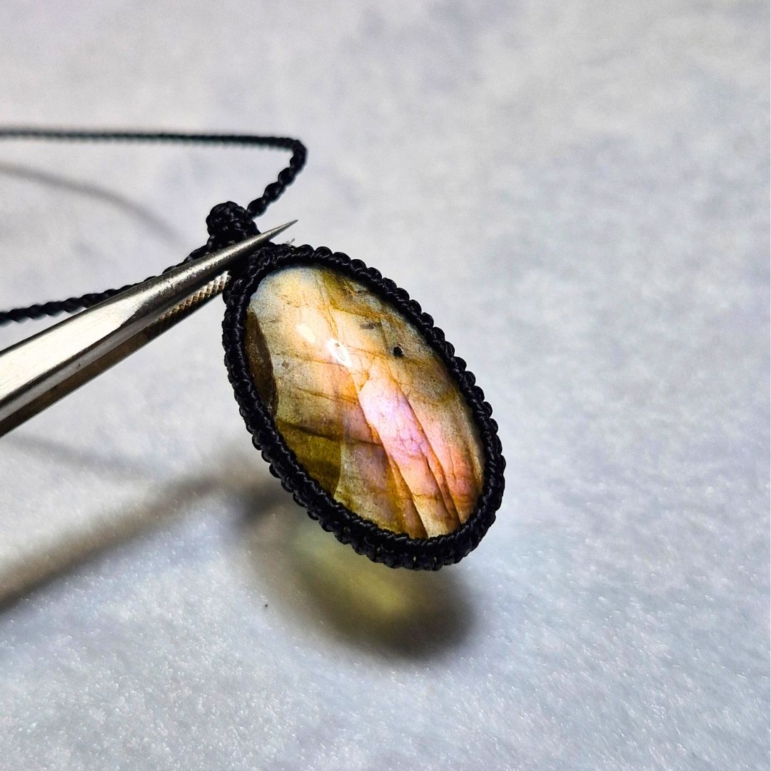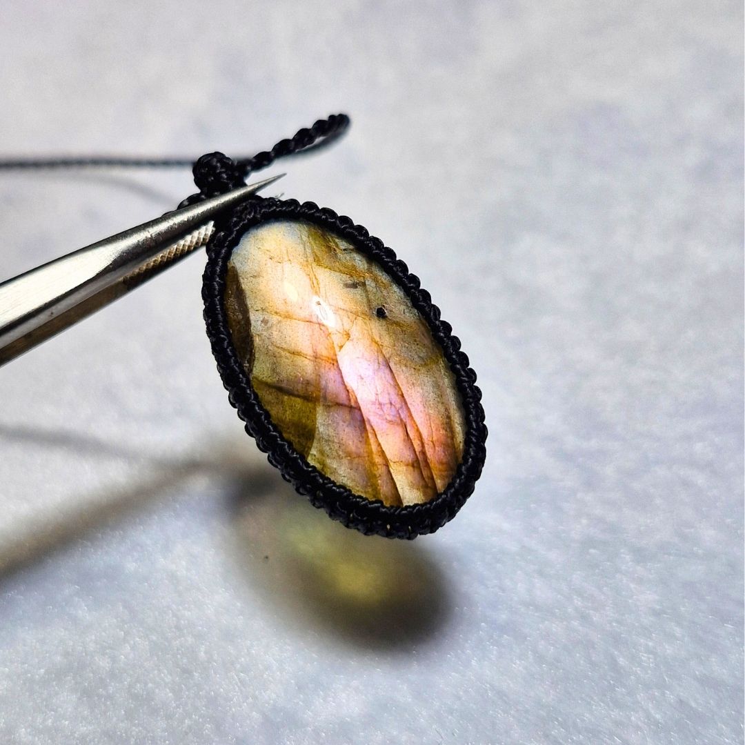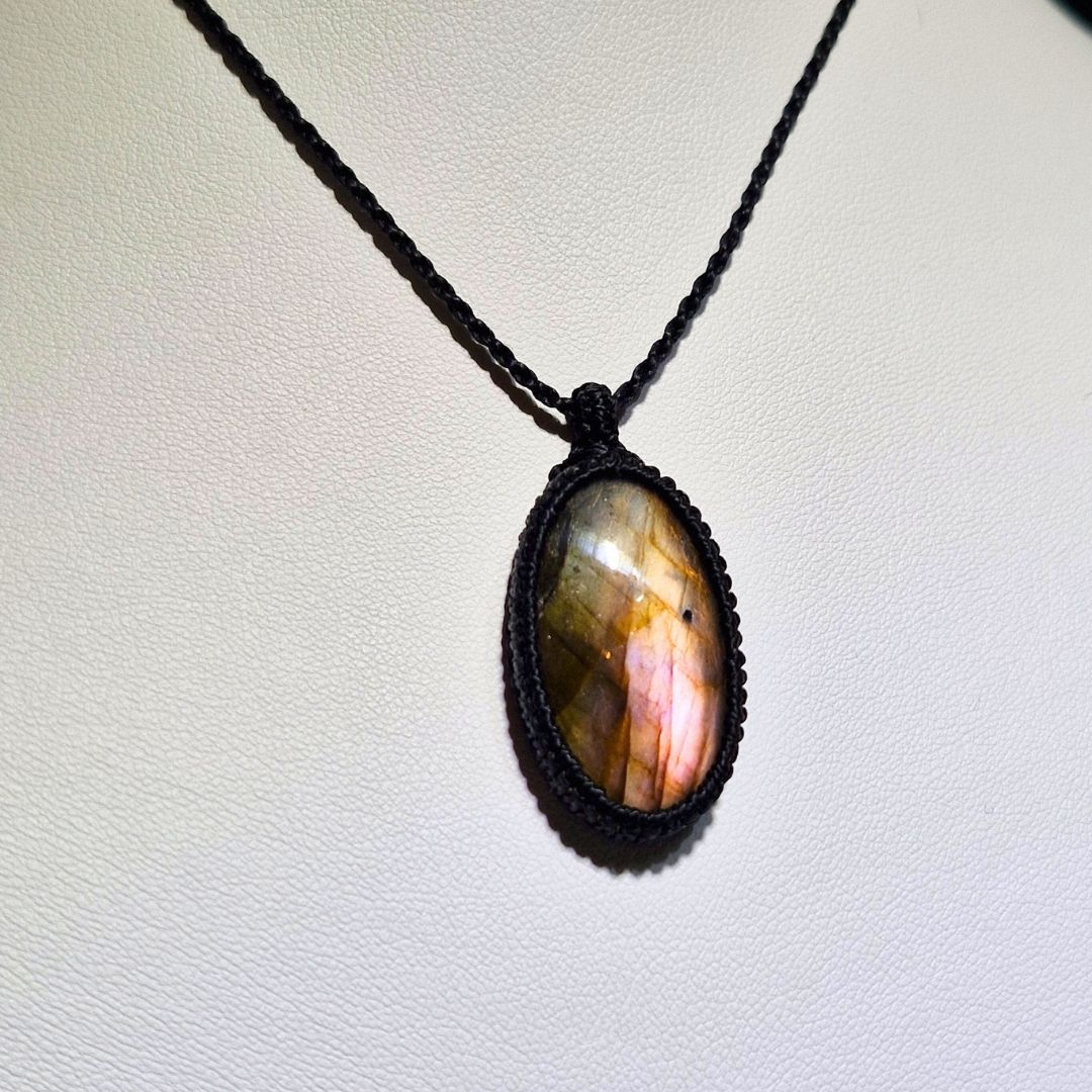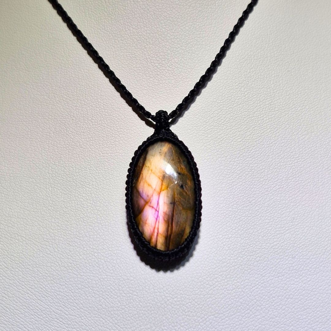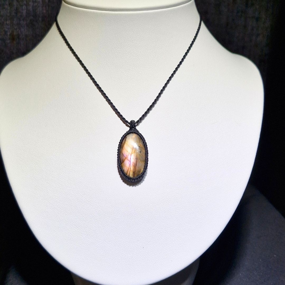 輝くラブラドライトを使用したこの美しいマクラメペンダントは、
