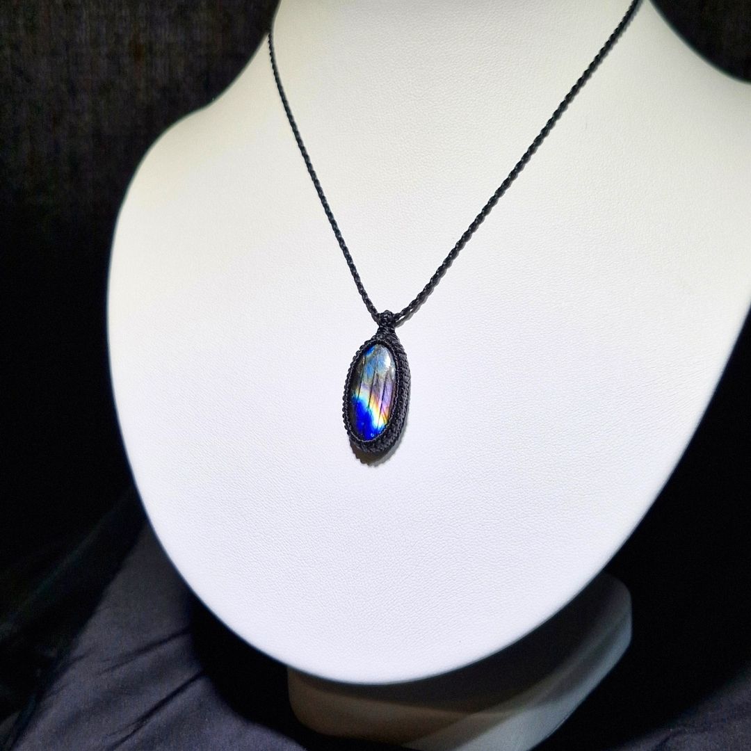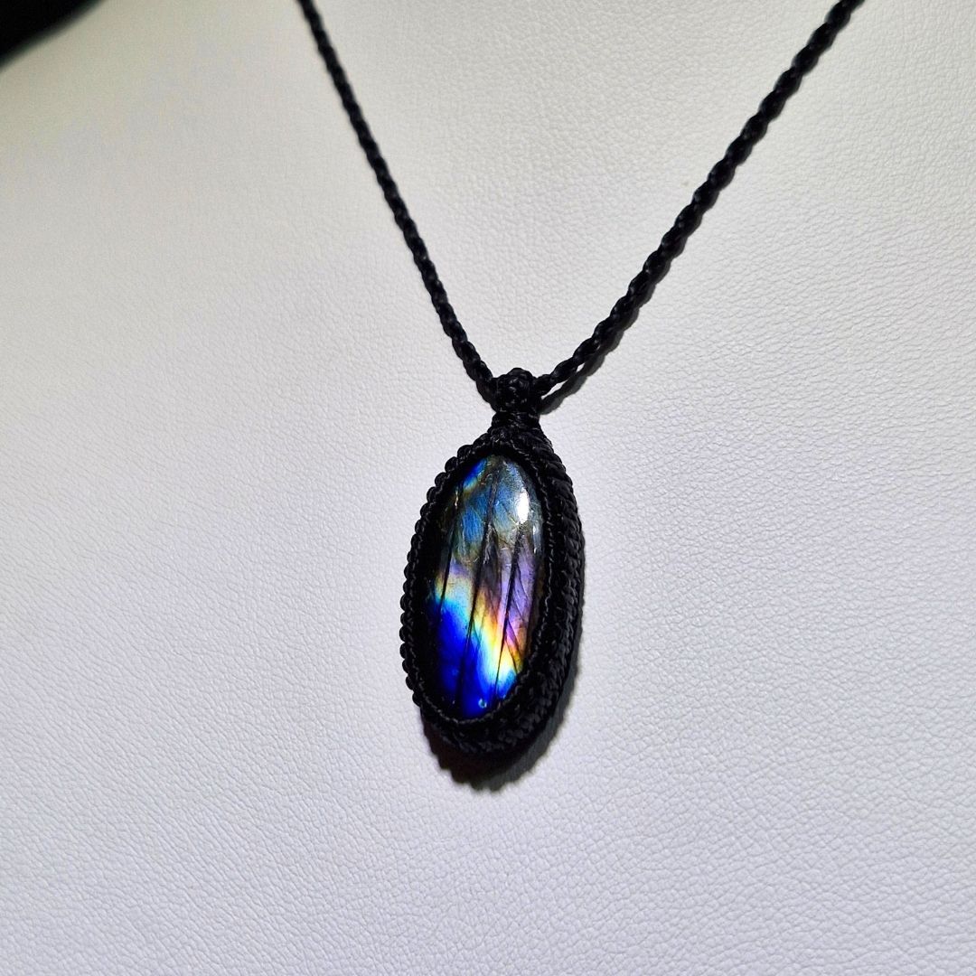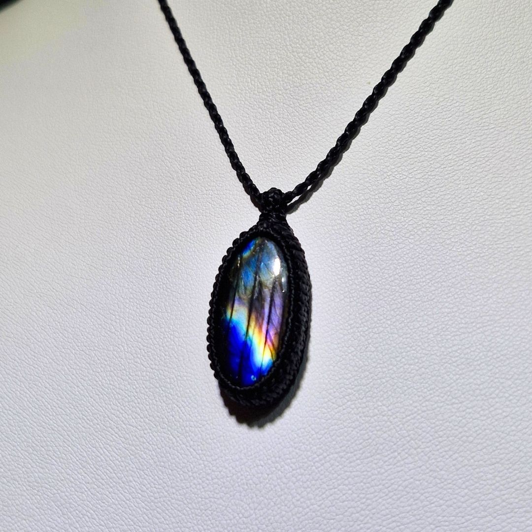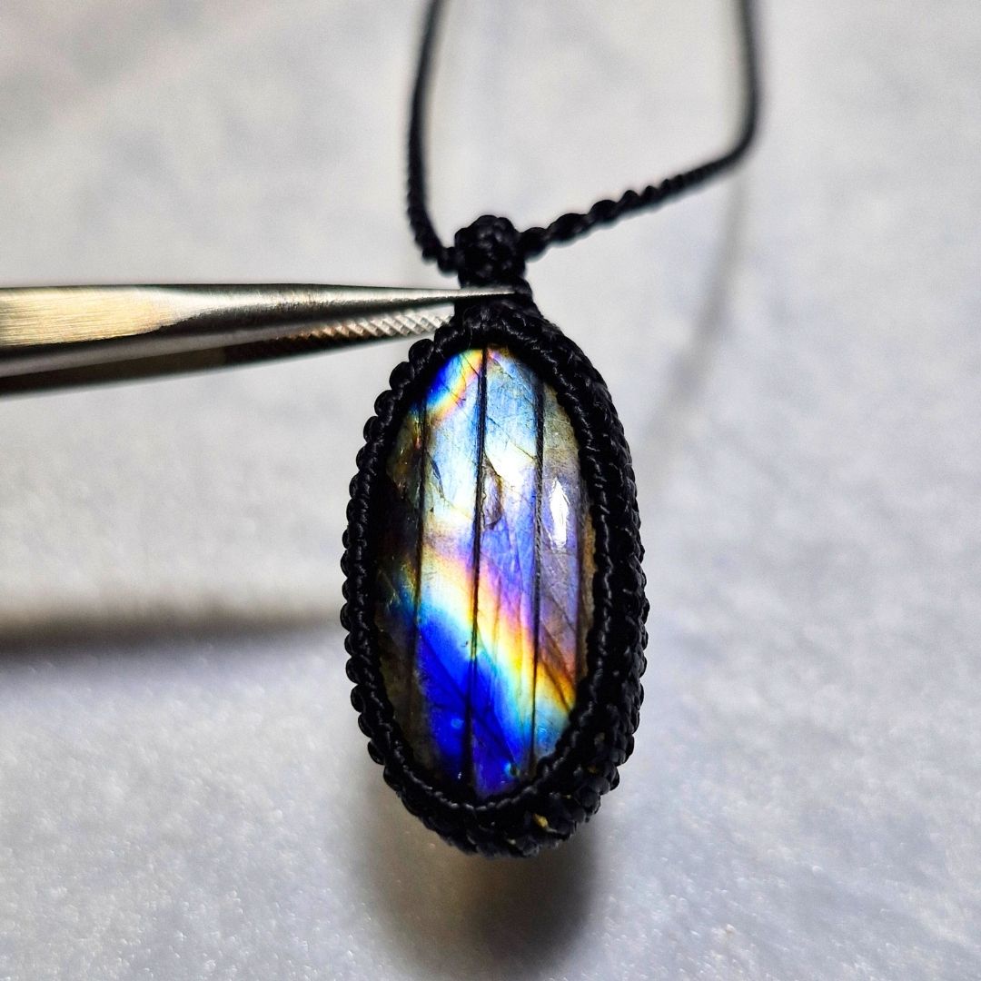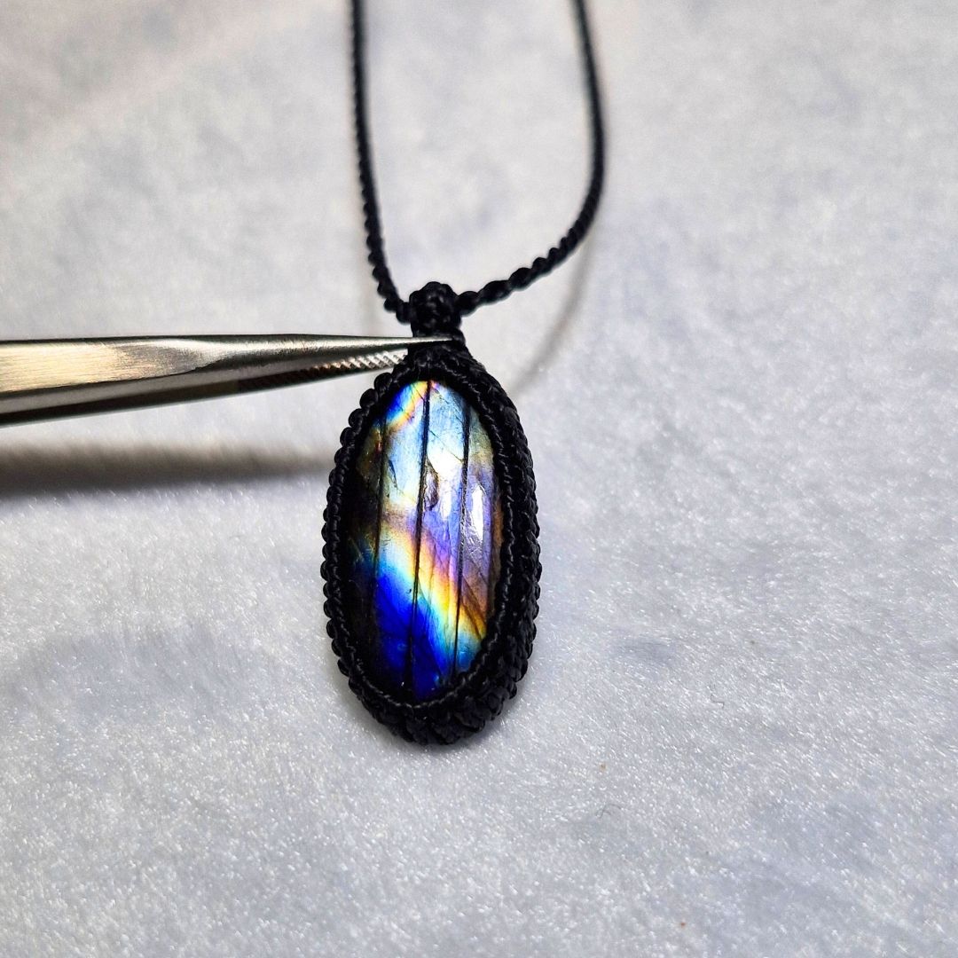 輝くラブラドライトを使用したこの美しいマクラメペンダントは、