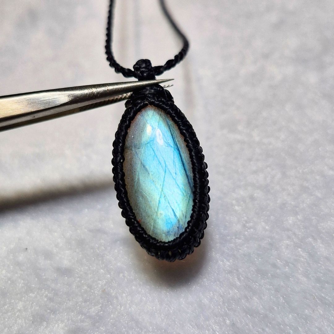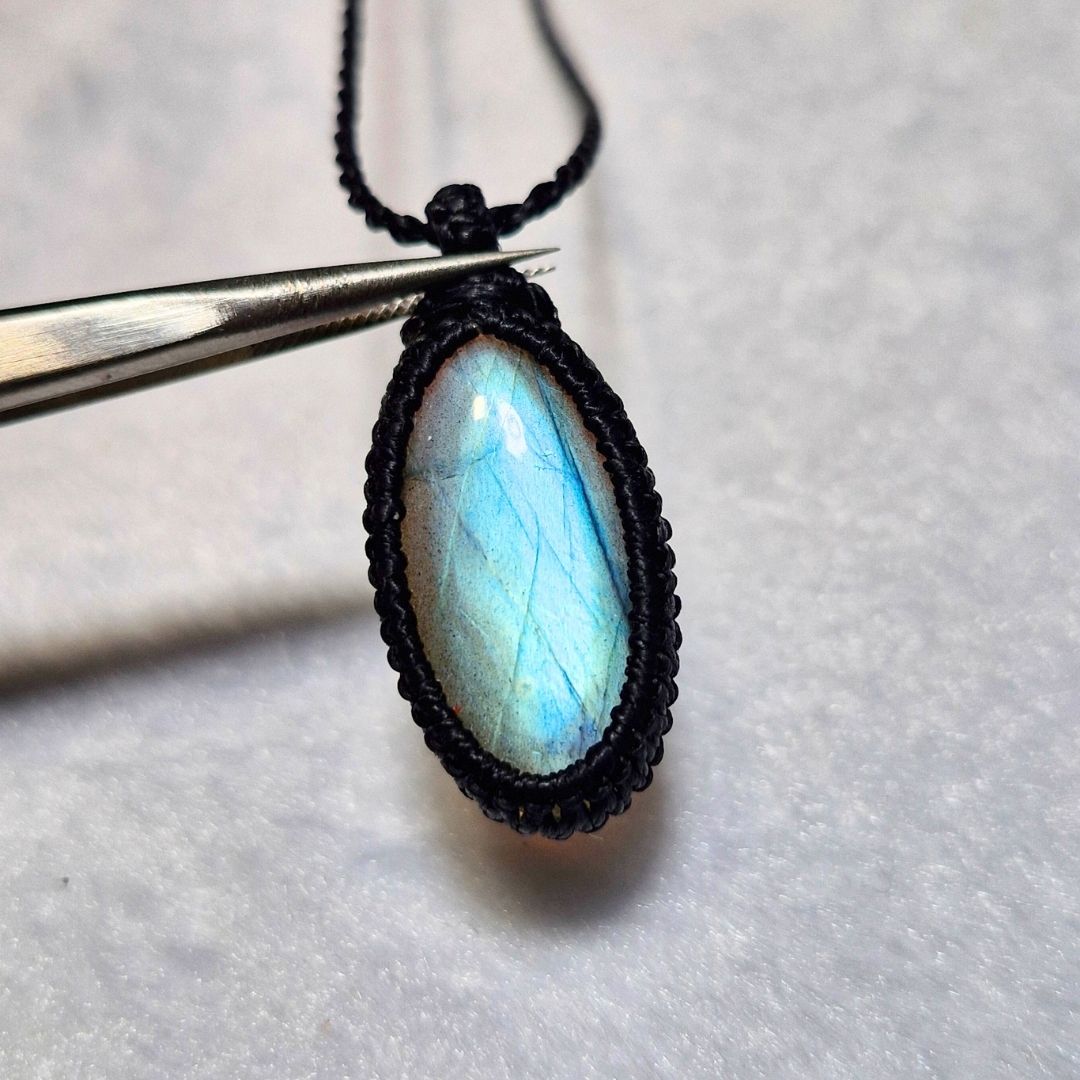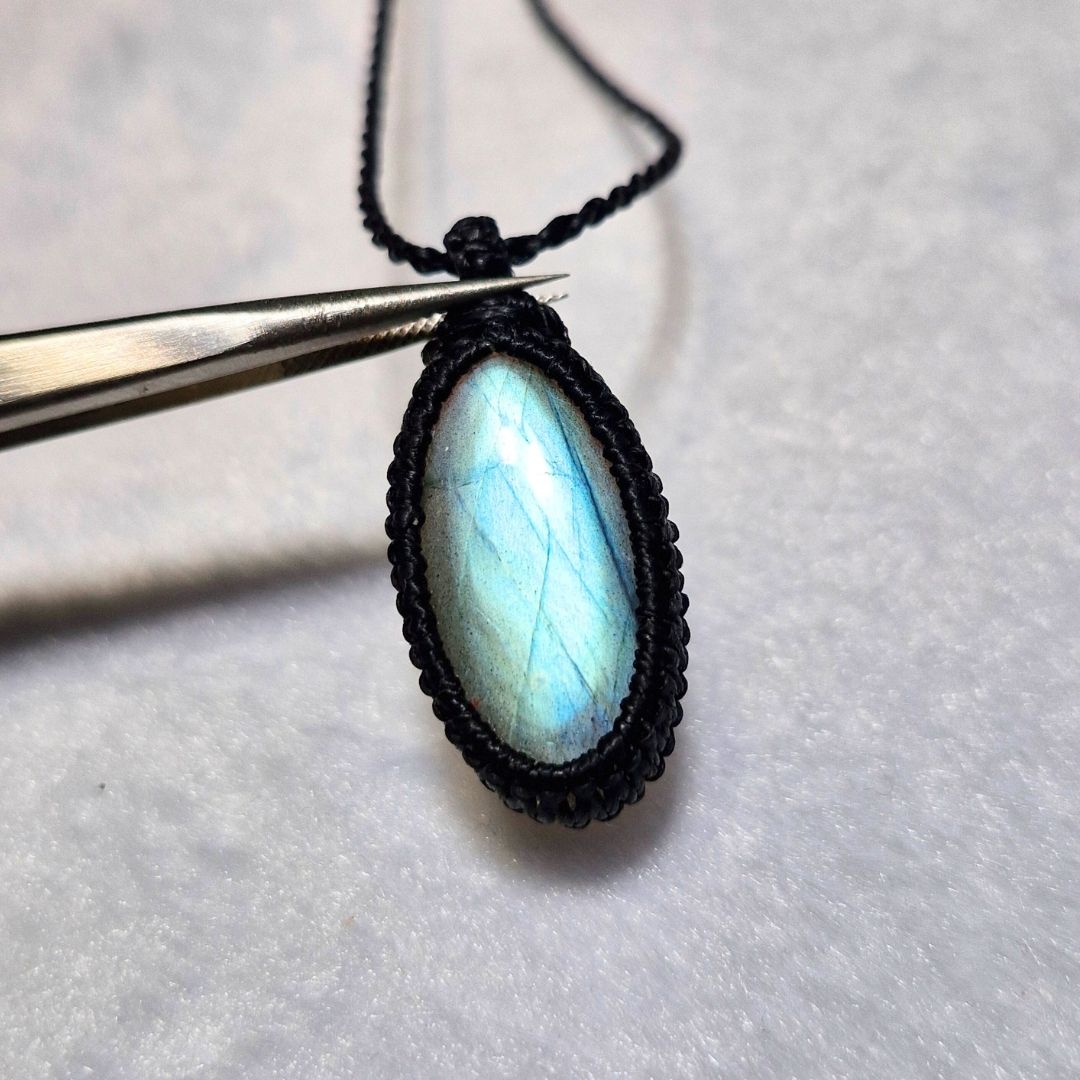 輝くラブラドライトを使用したこの美しいマクラメペンダントは、
