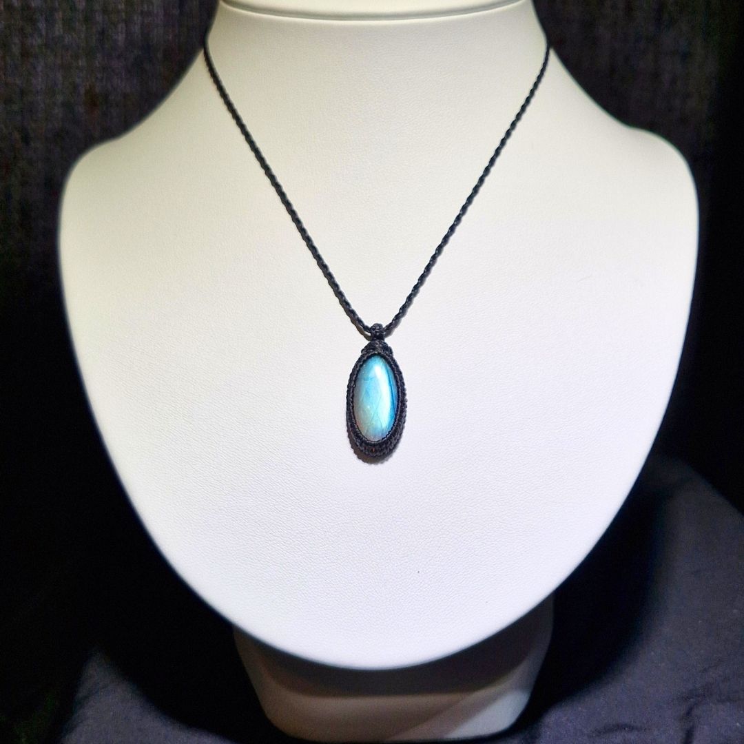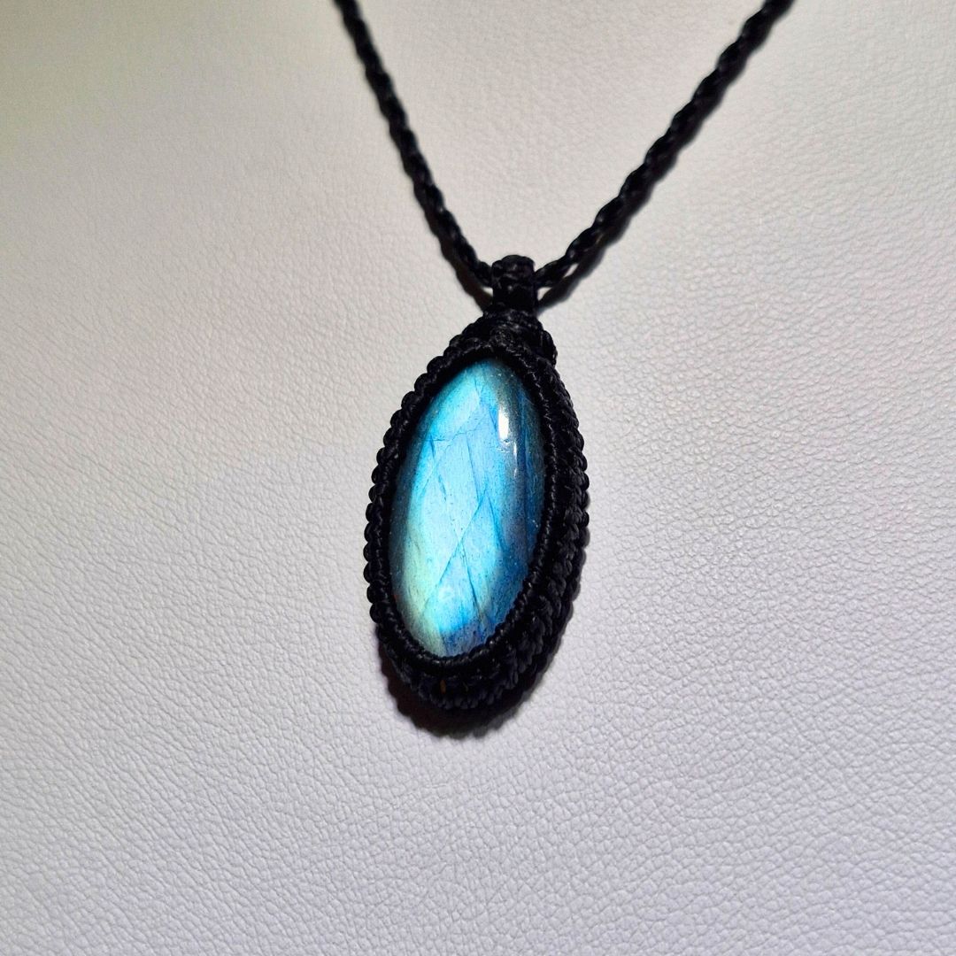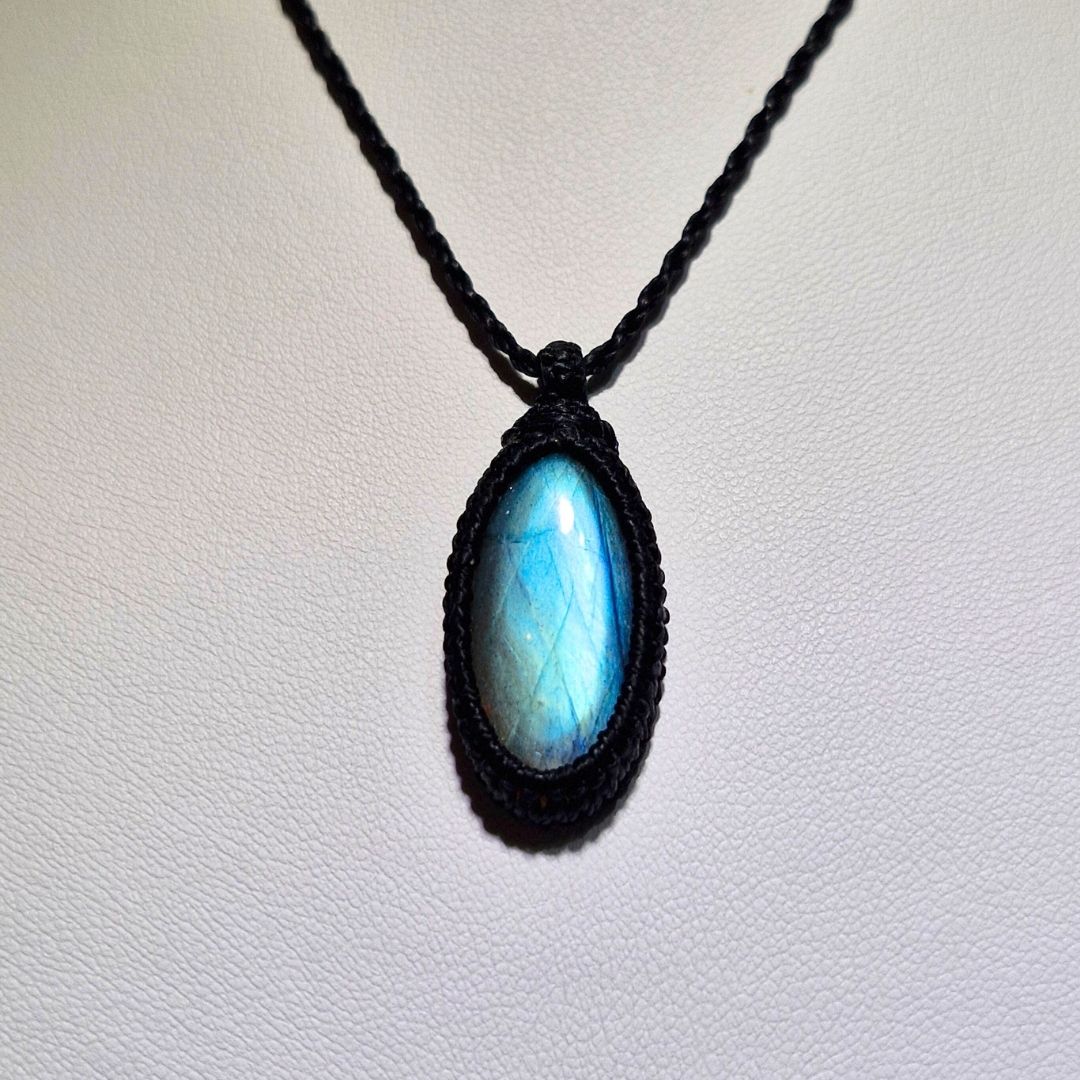 輝くラブラドライトを使用したこの美しいマクラメペンダントは、