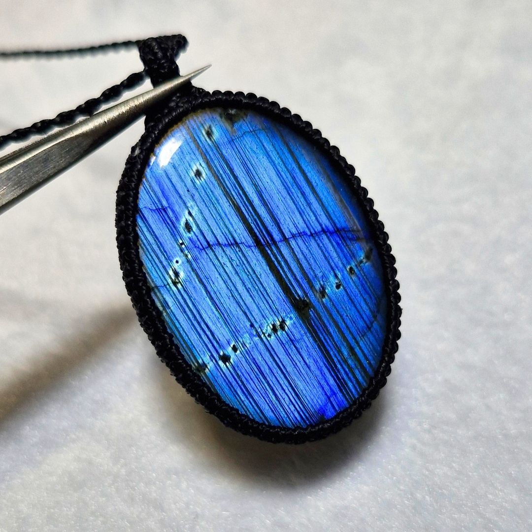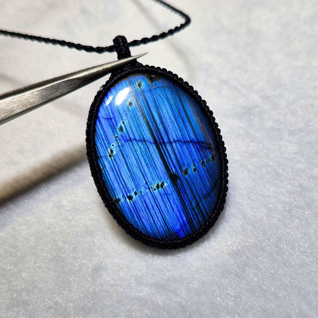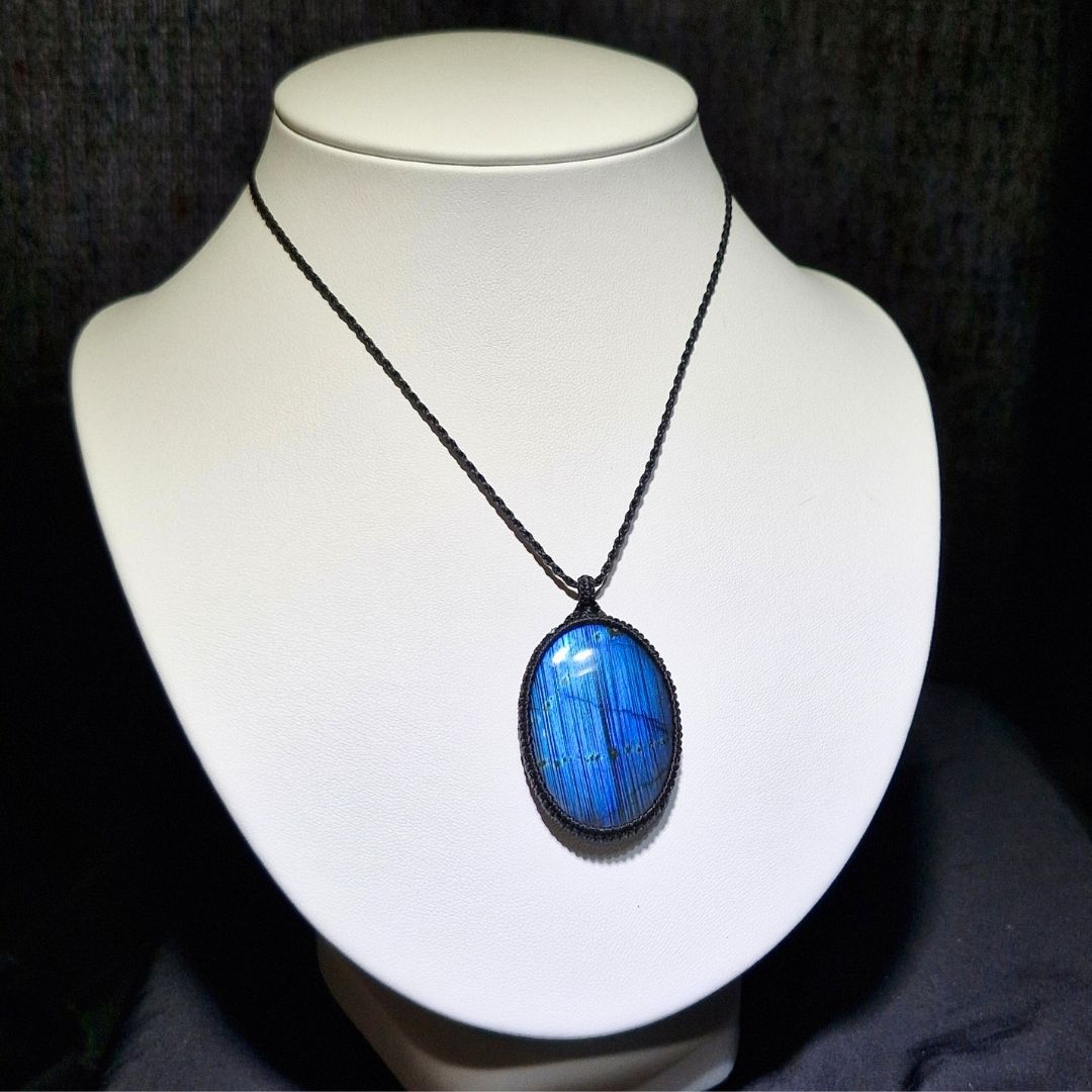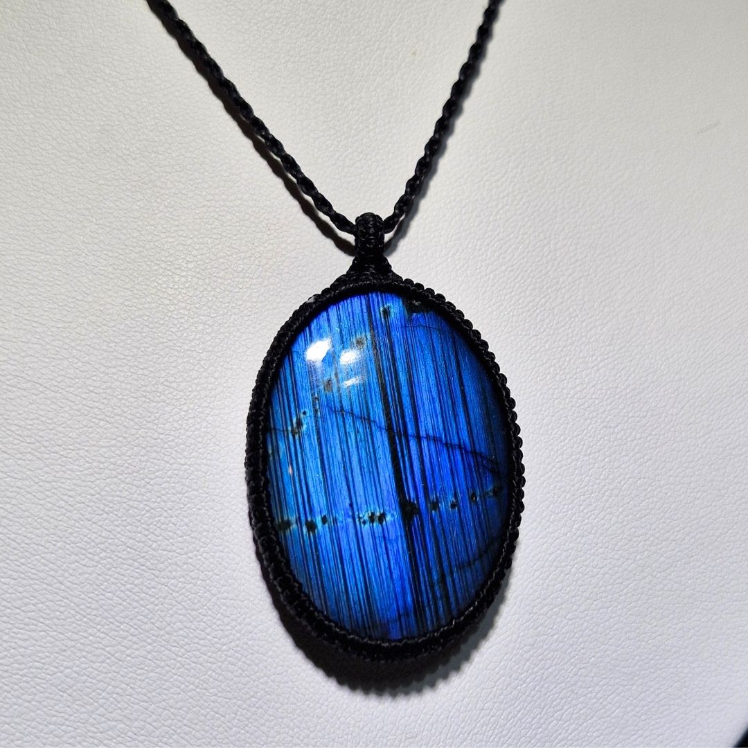 輝くラブラドライトを使用したこの美しいマクラメペンダントは、