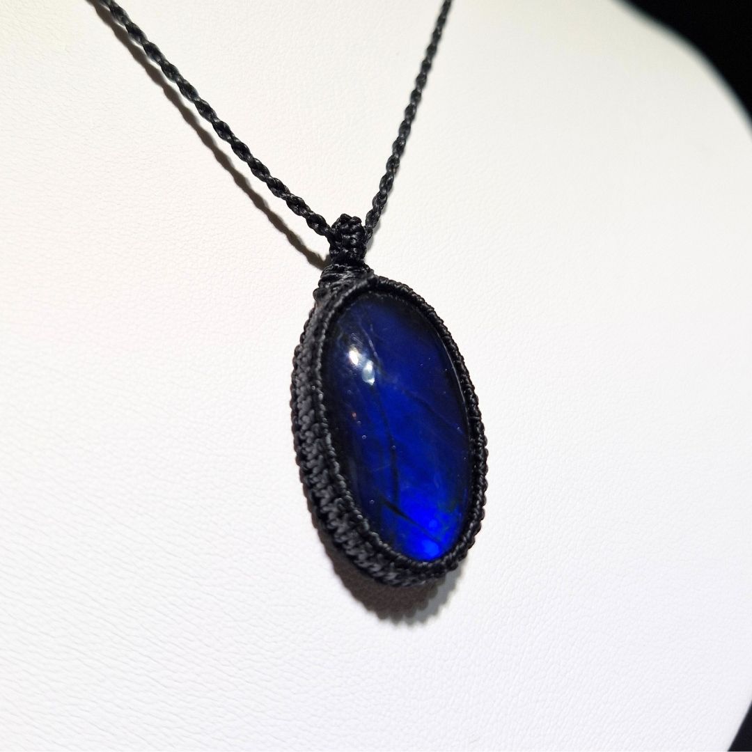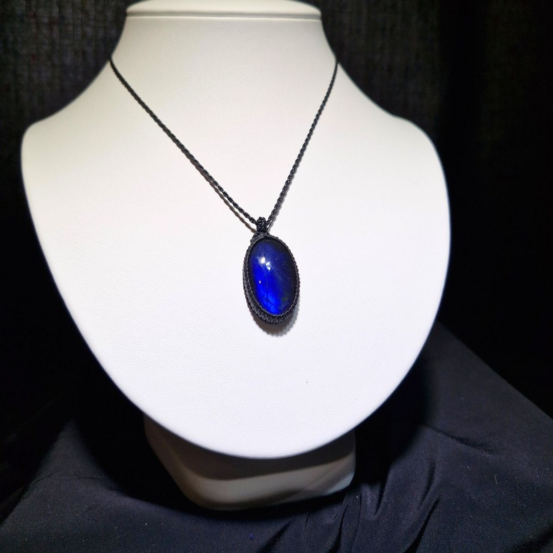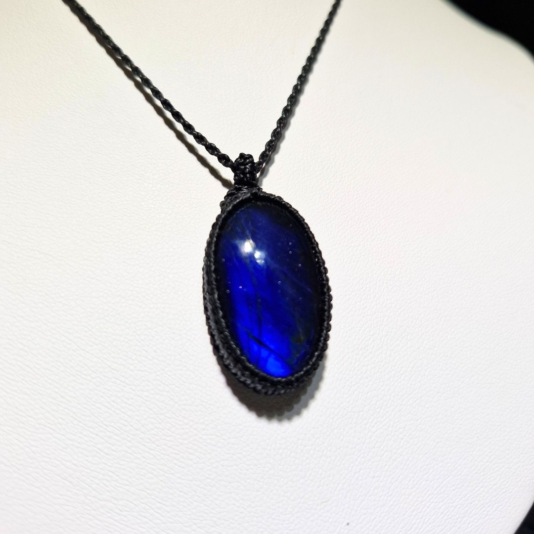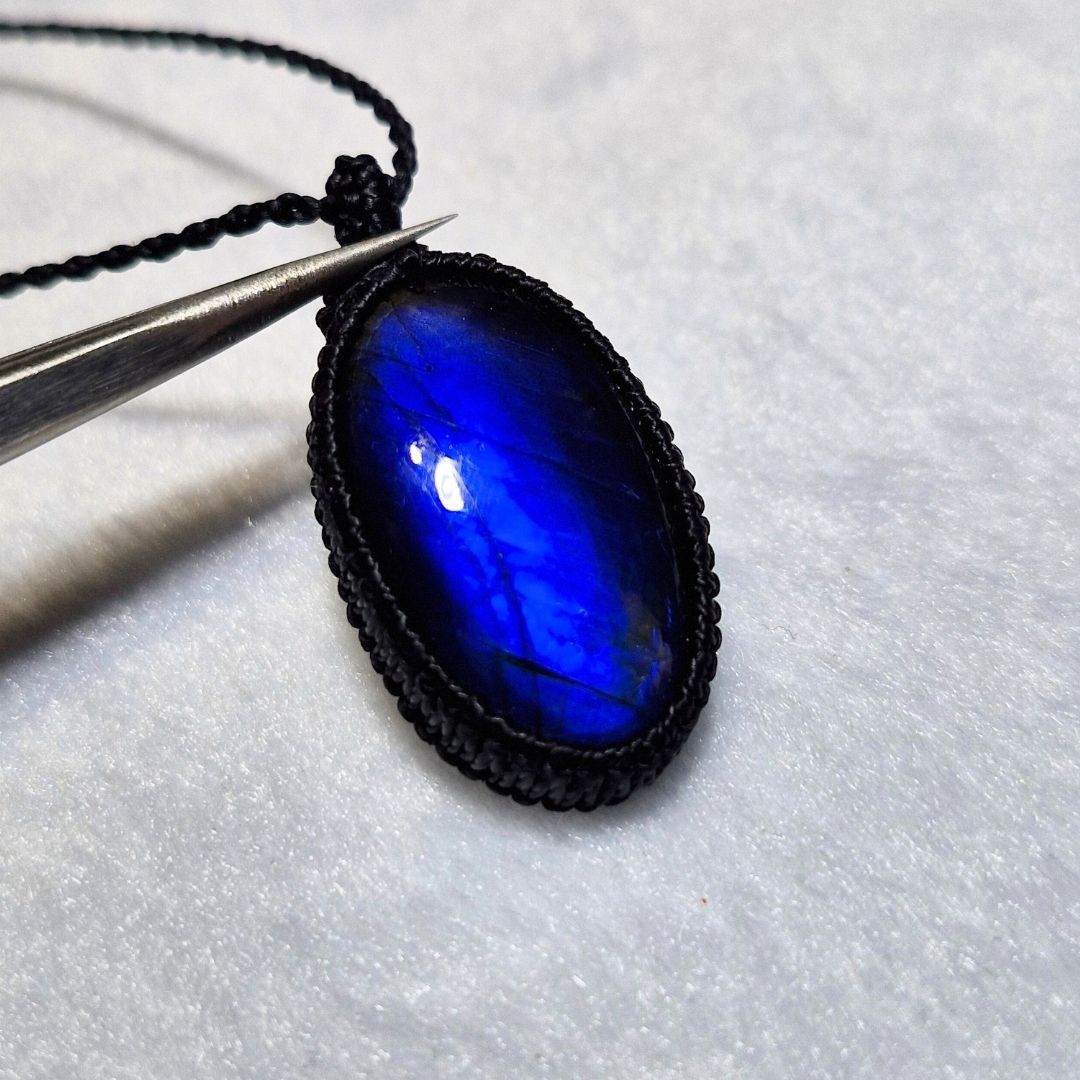 輝くラブラドライトを使用したこの美しいマクラメペンダントは、