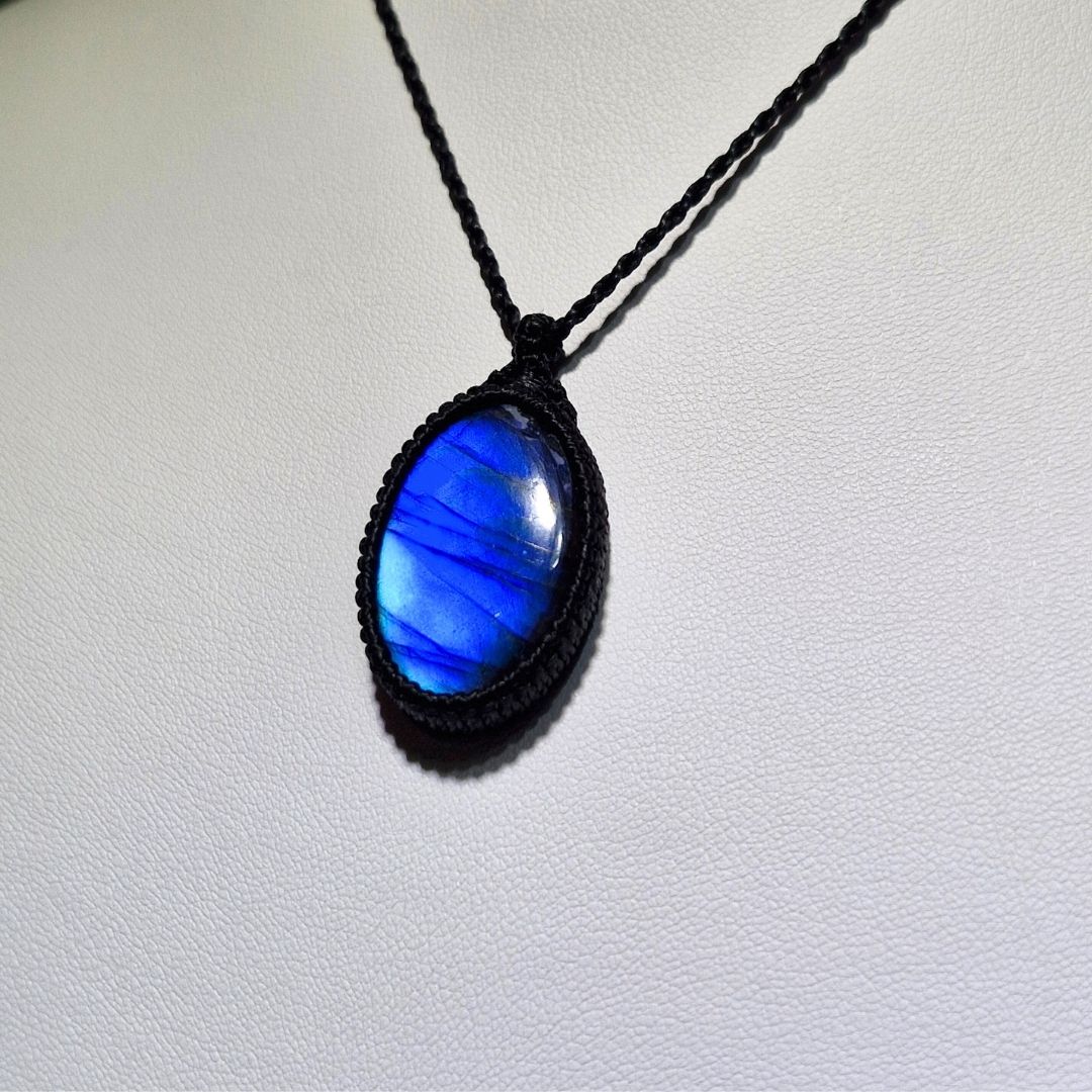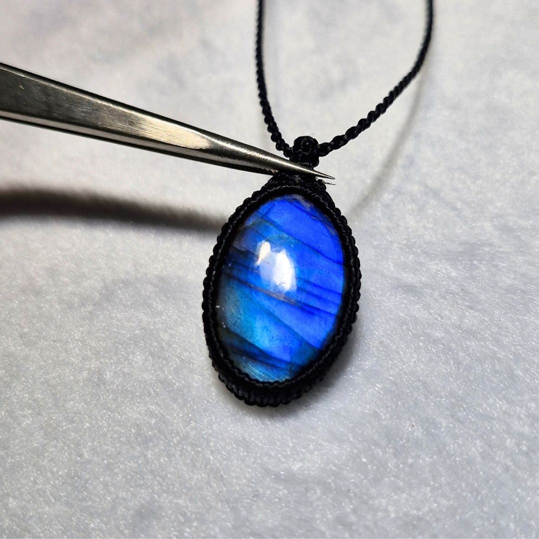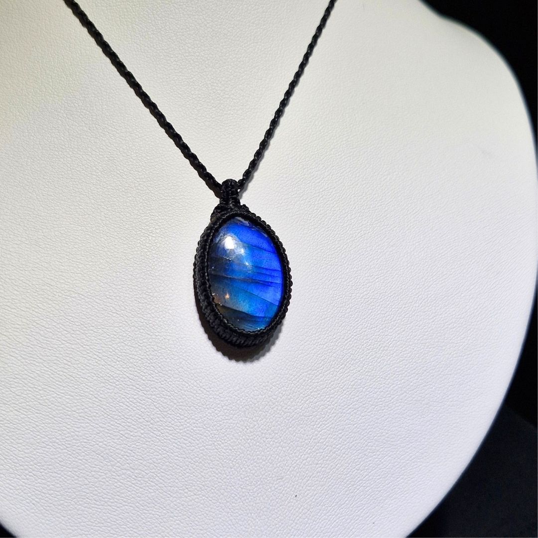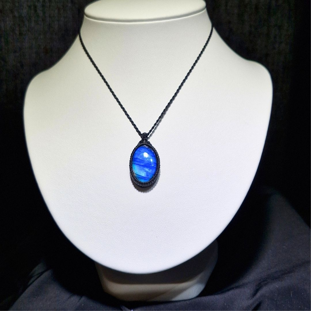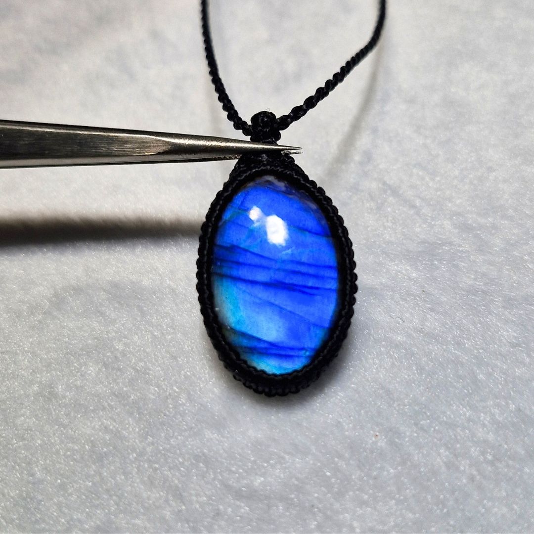 輝くラブラドライトを使用したこの美しいマクラメペンダントは、