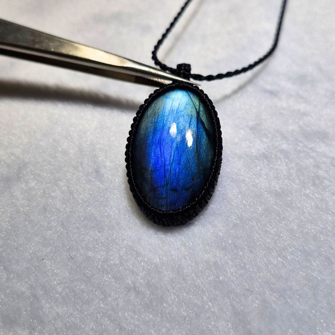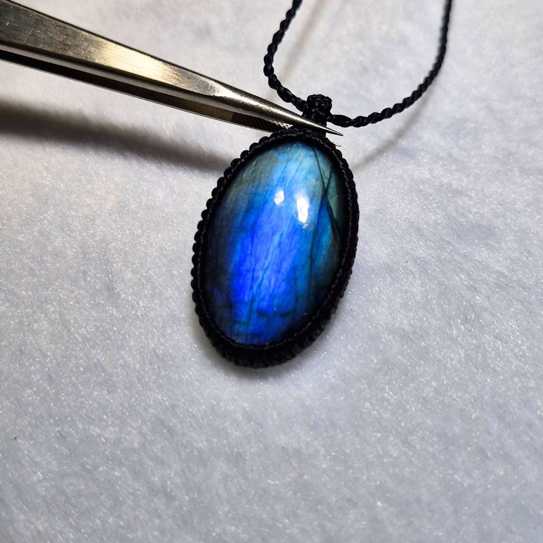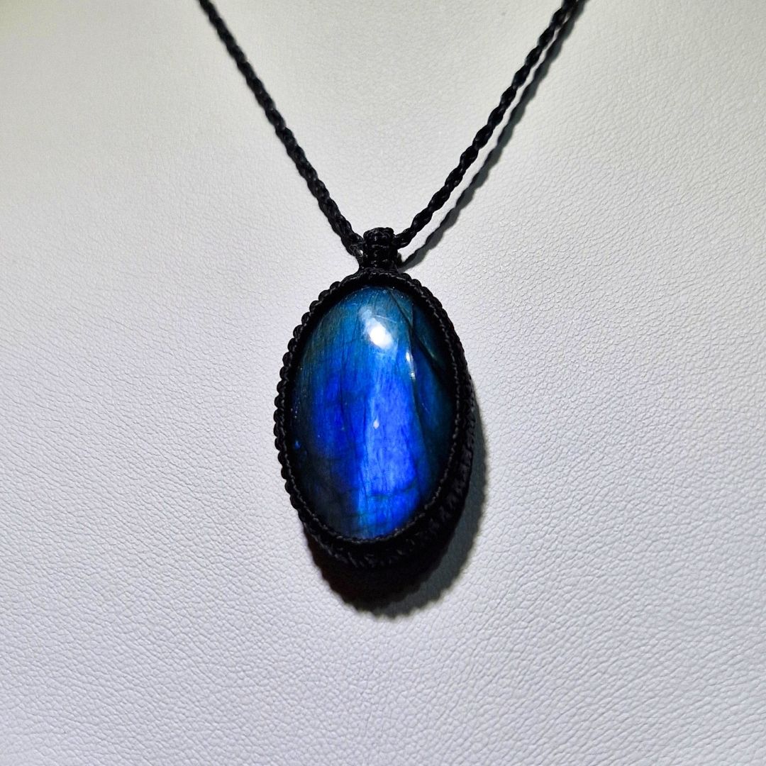 輝くラブラドライトを使用したこの美しいマクラメペンダントは、