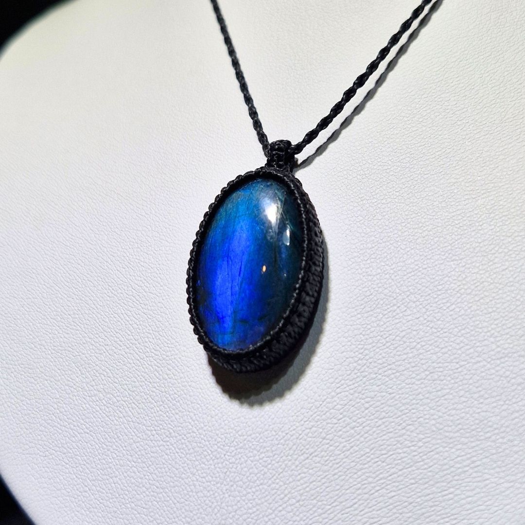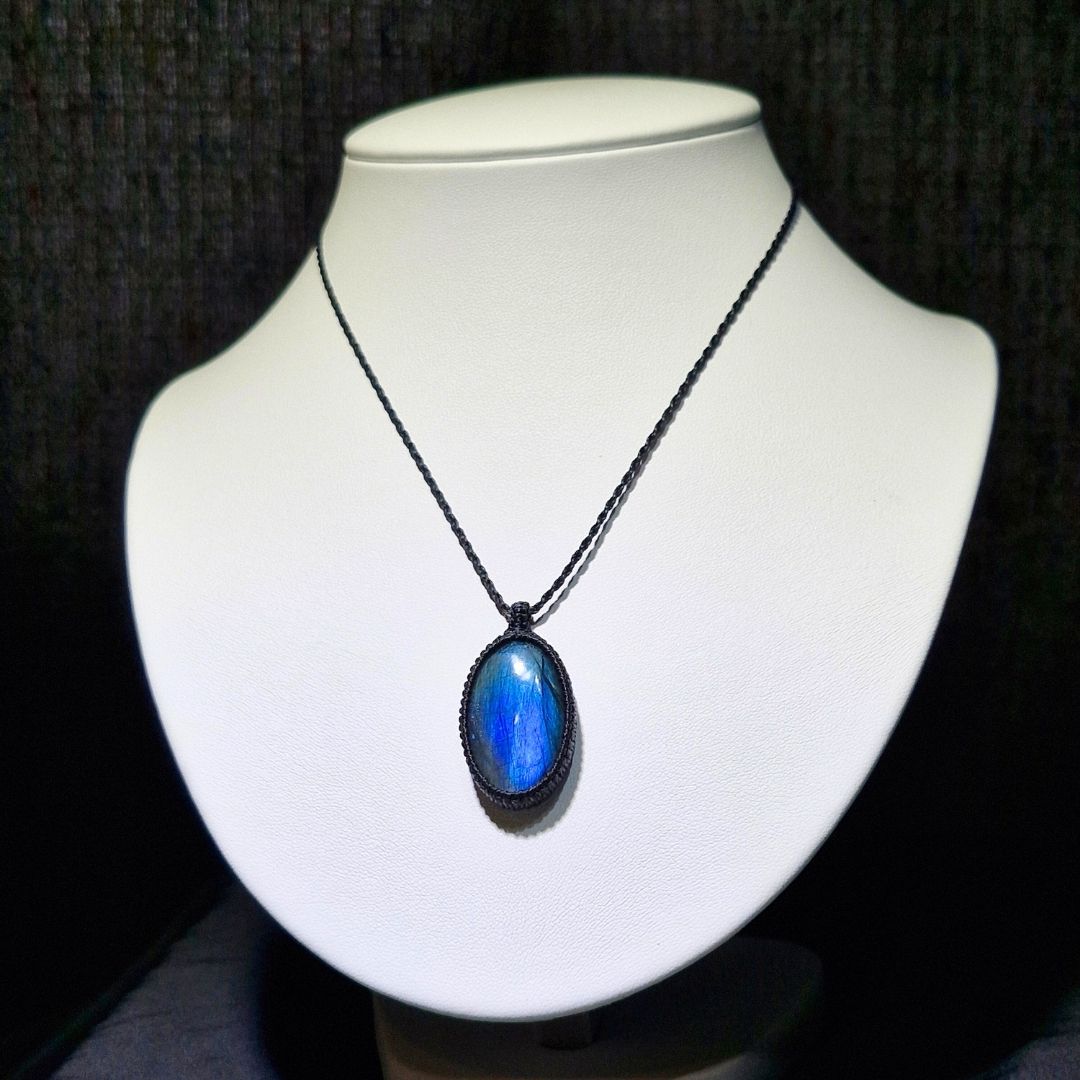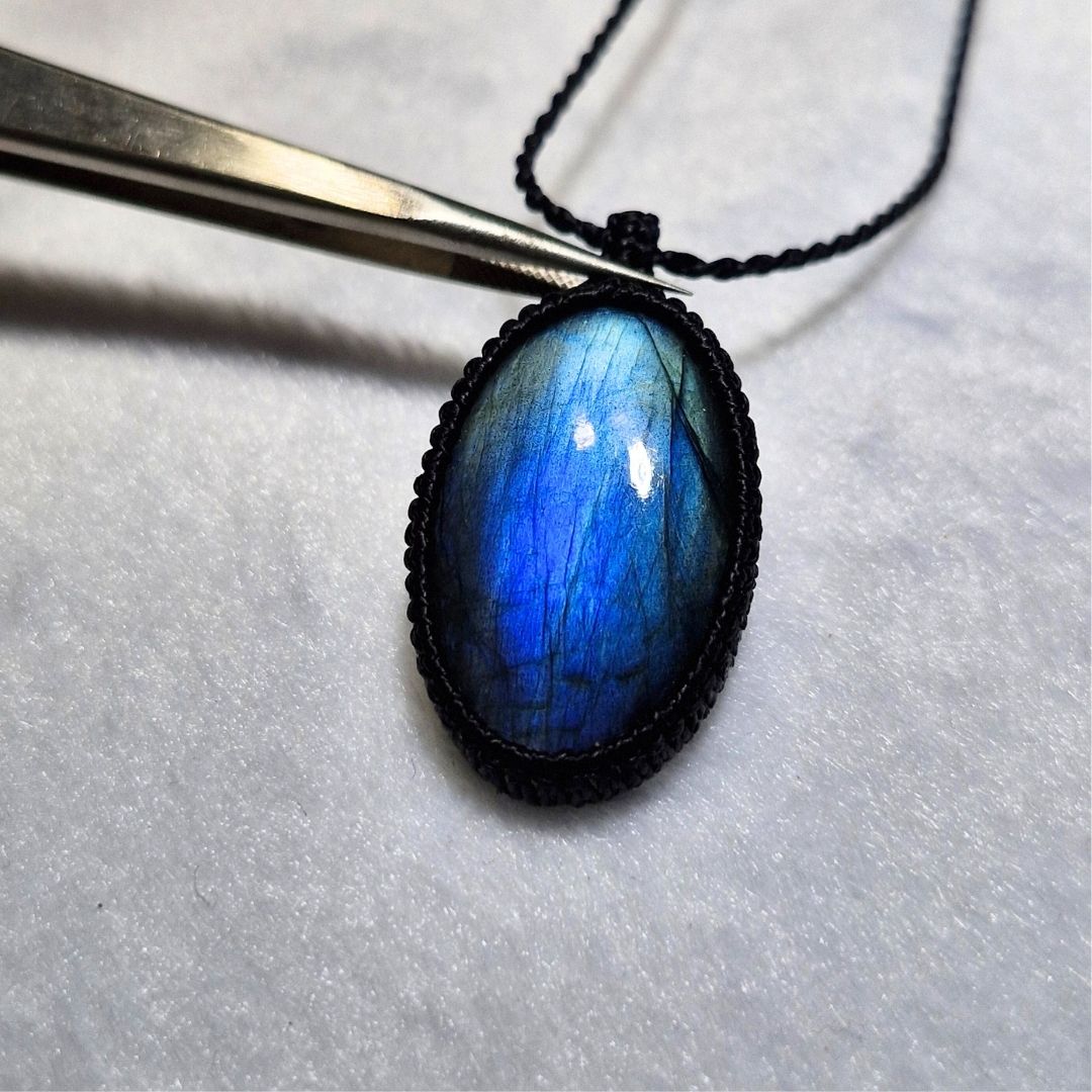 輝くラブラドライトを使用したこの美しいマクラメペンダントは、