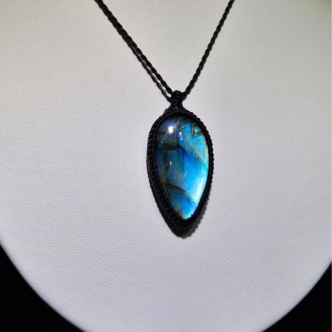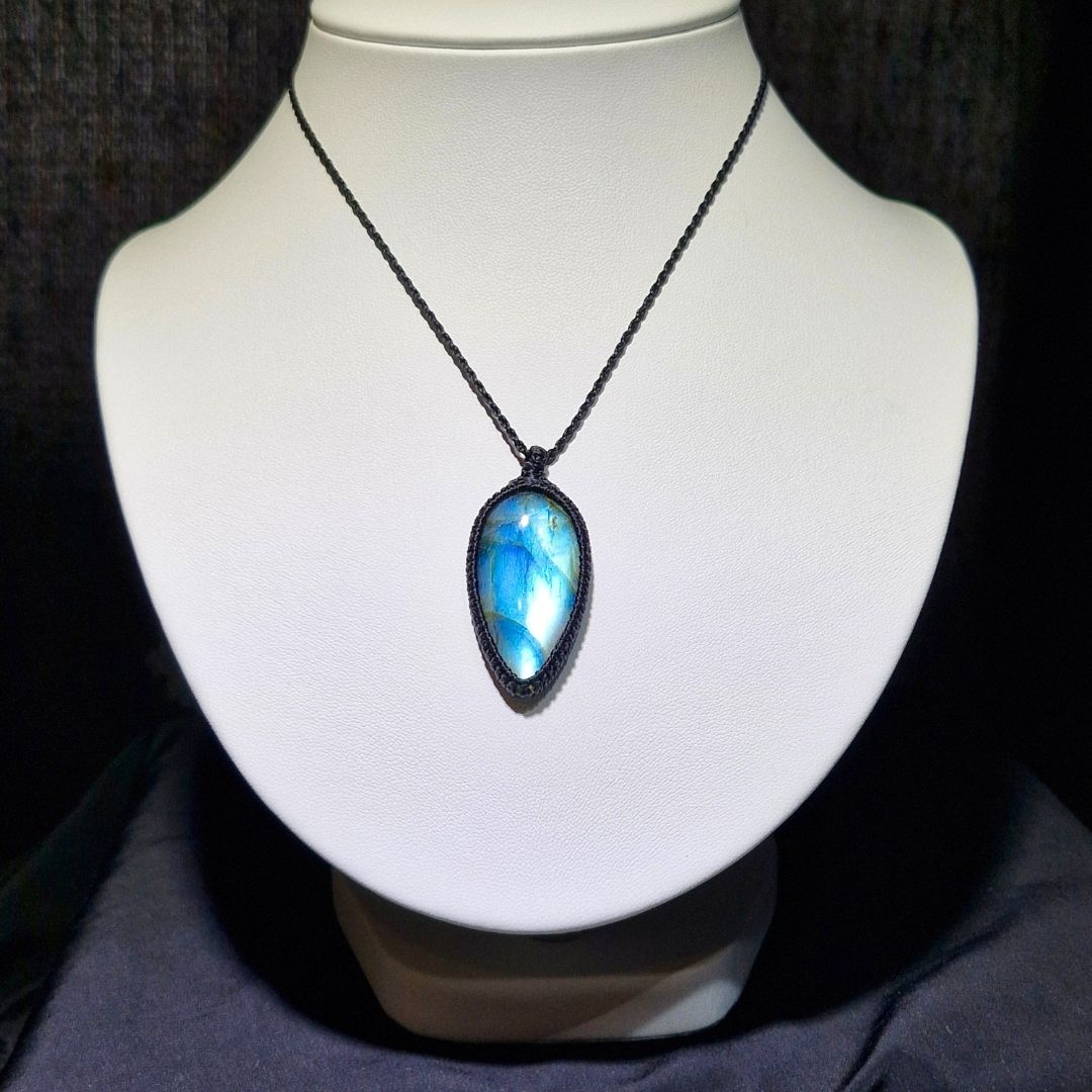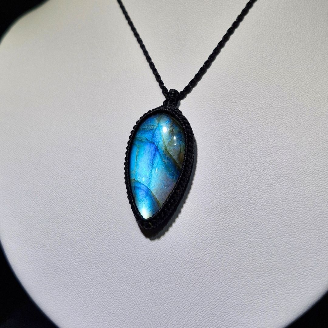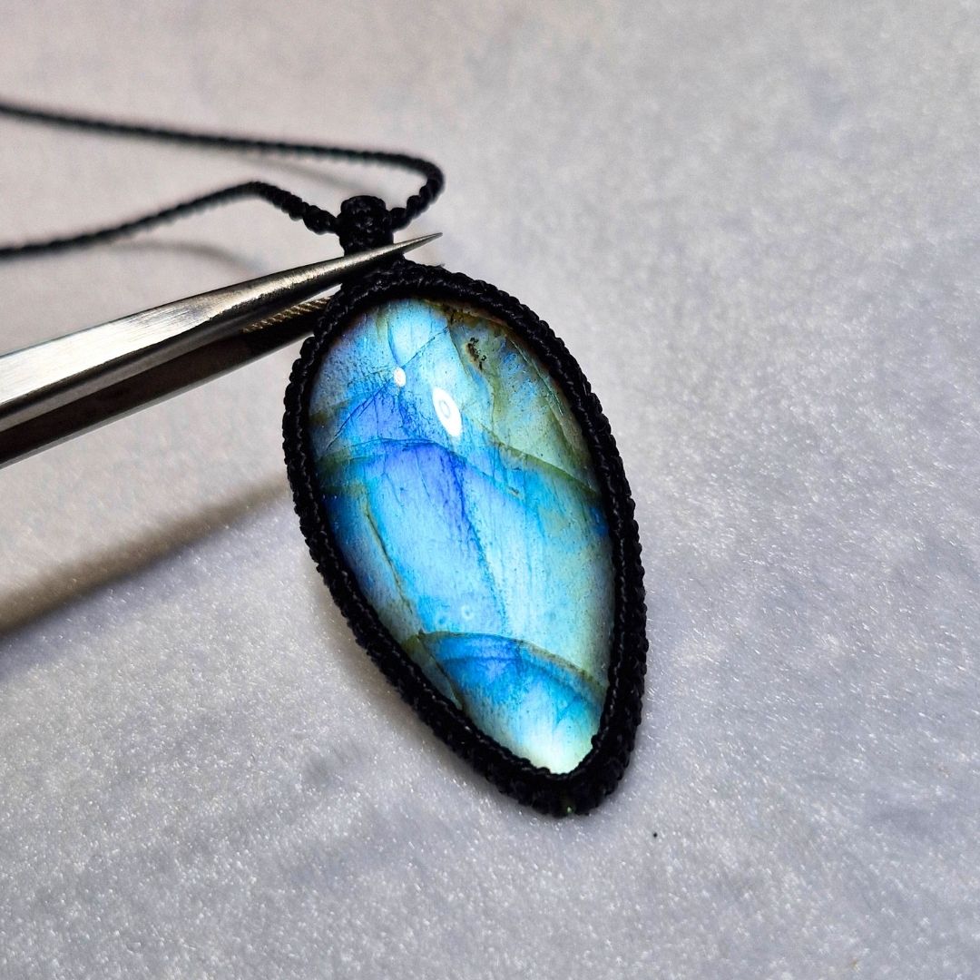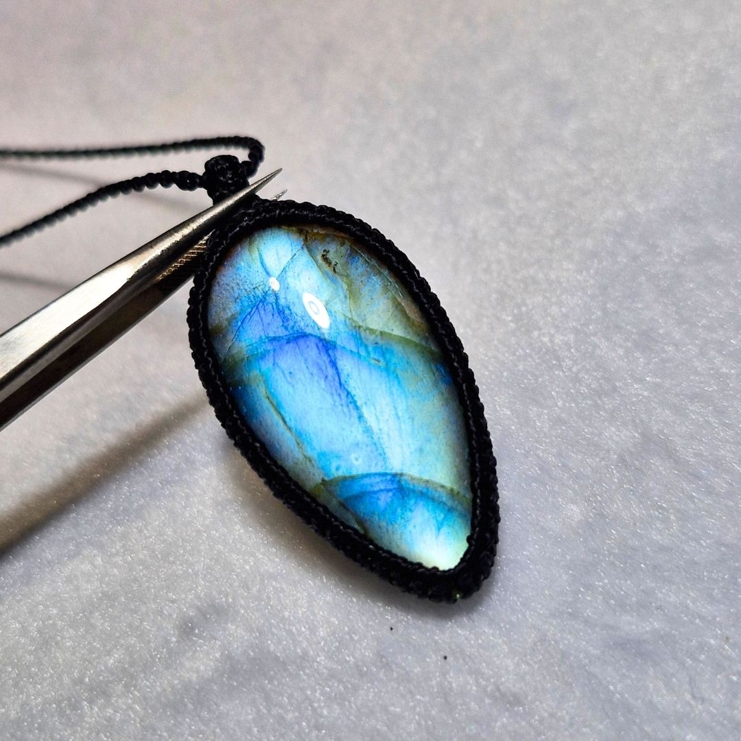 輝くラブラドライトを使用したこの美しいマクラメペンダントは、