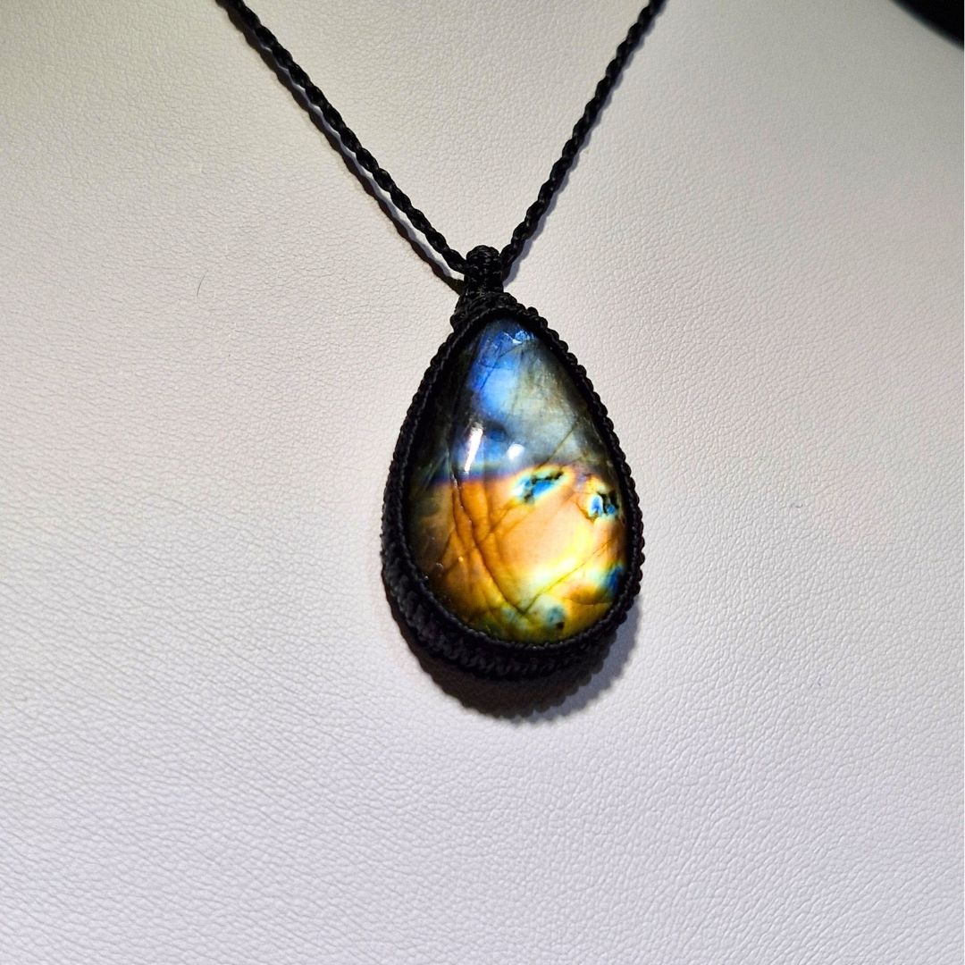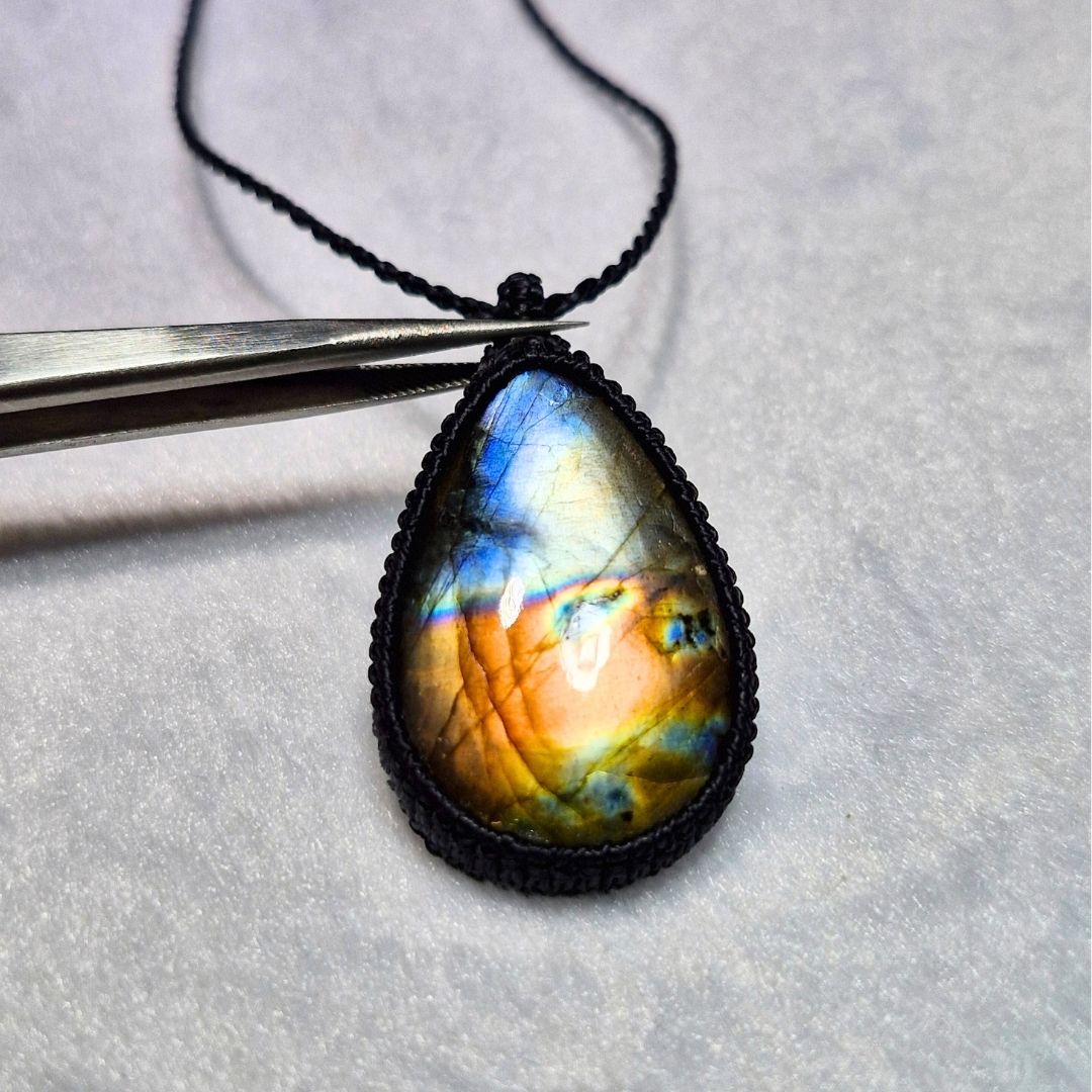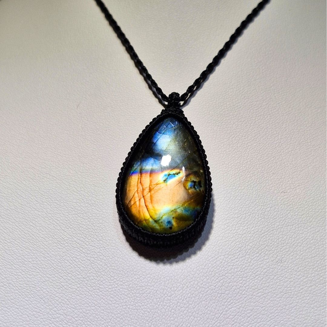 輝くラブラドライトを使用したこの美しいマクラメペンダントは、