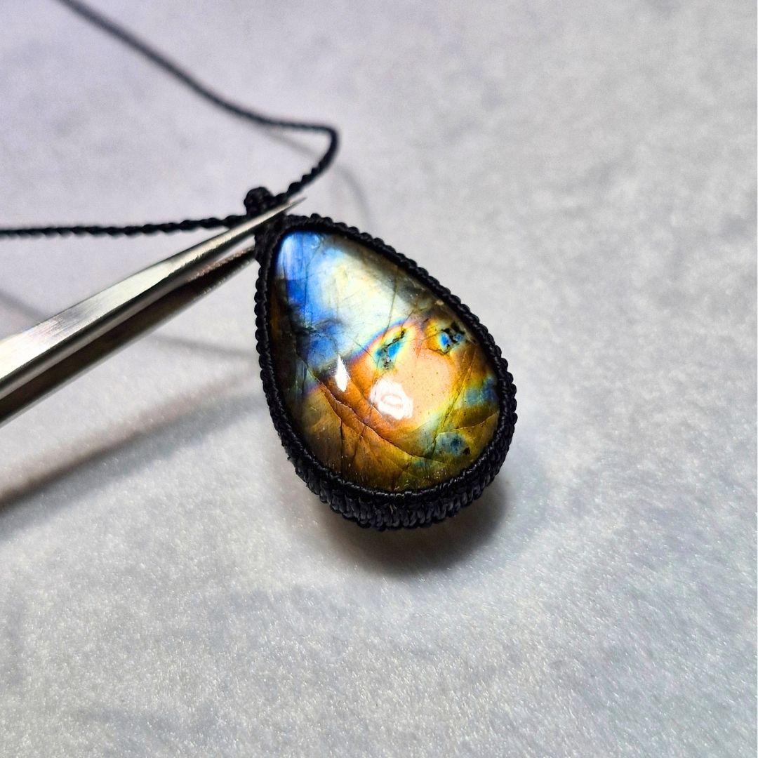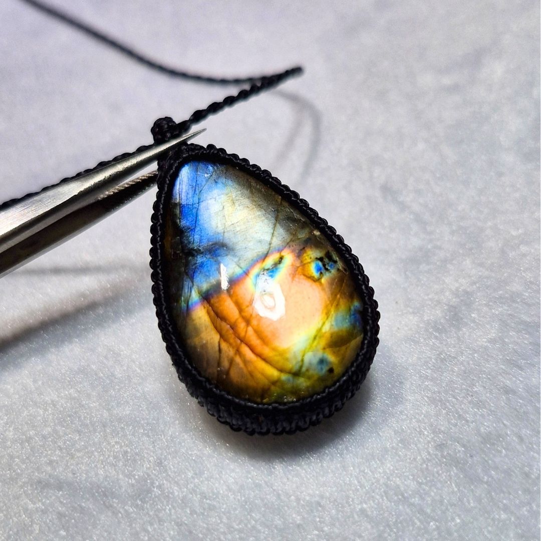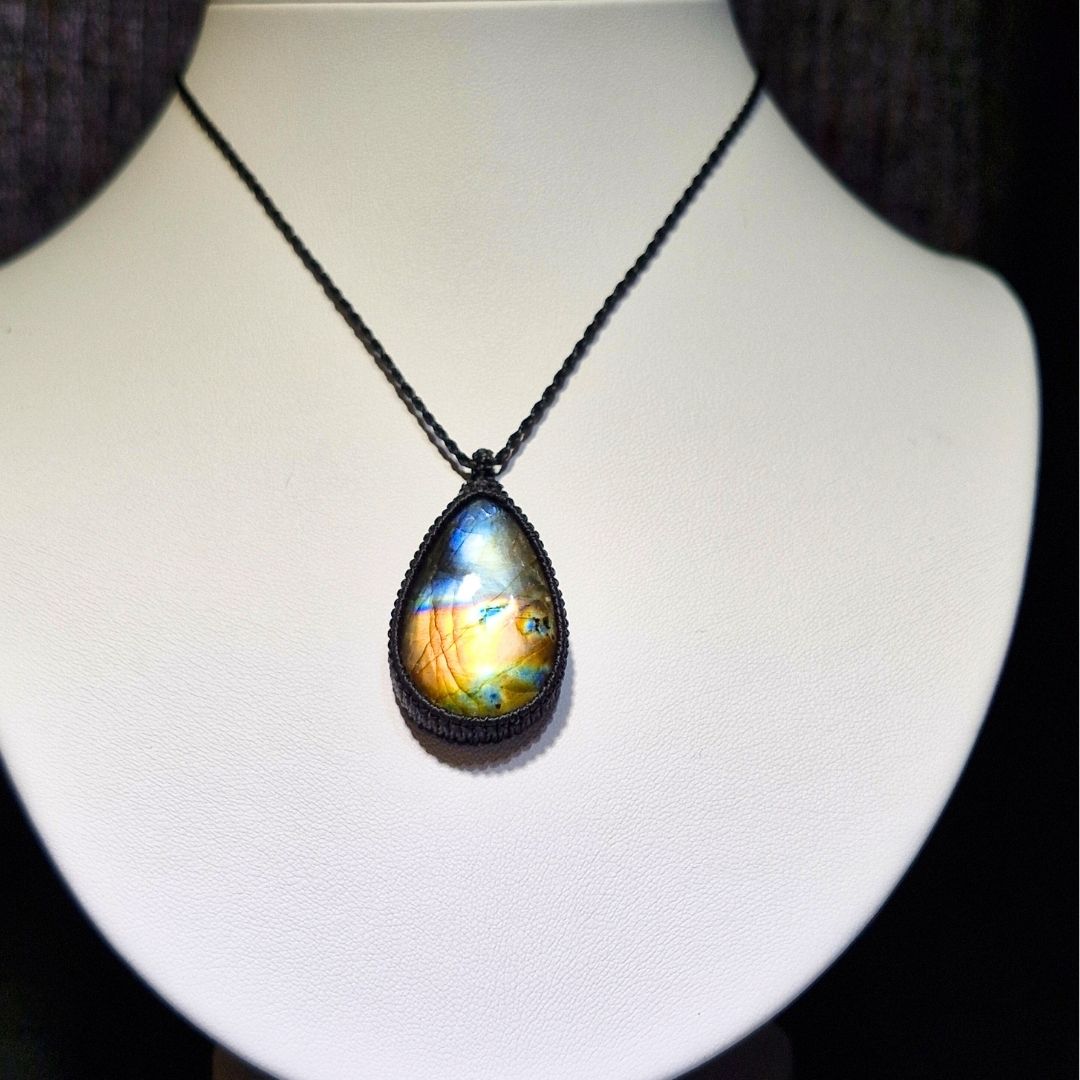 輝くラブラドライトを使用したこの美しいマクラメペンダントは、