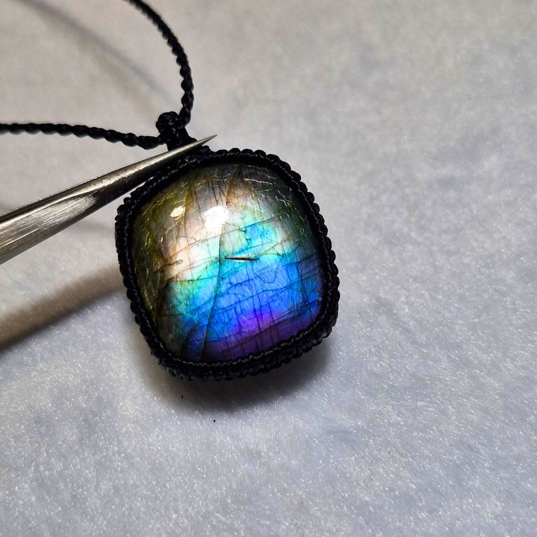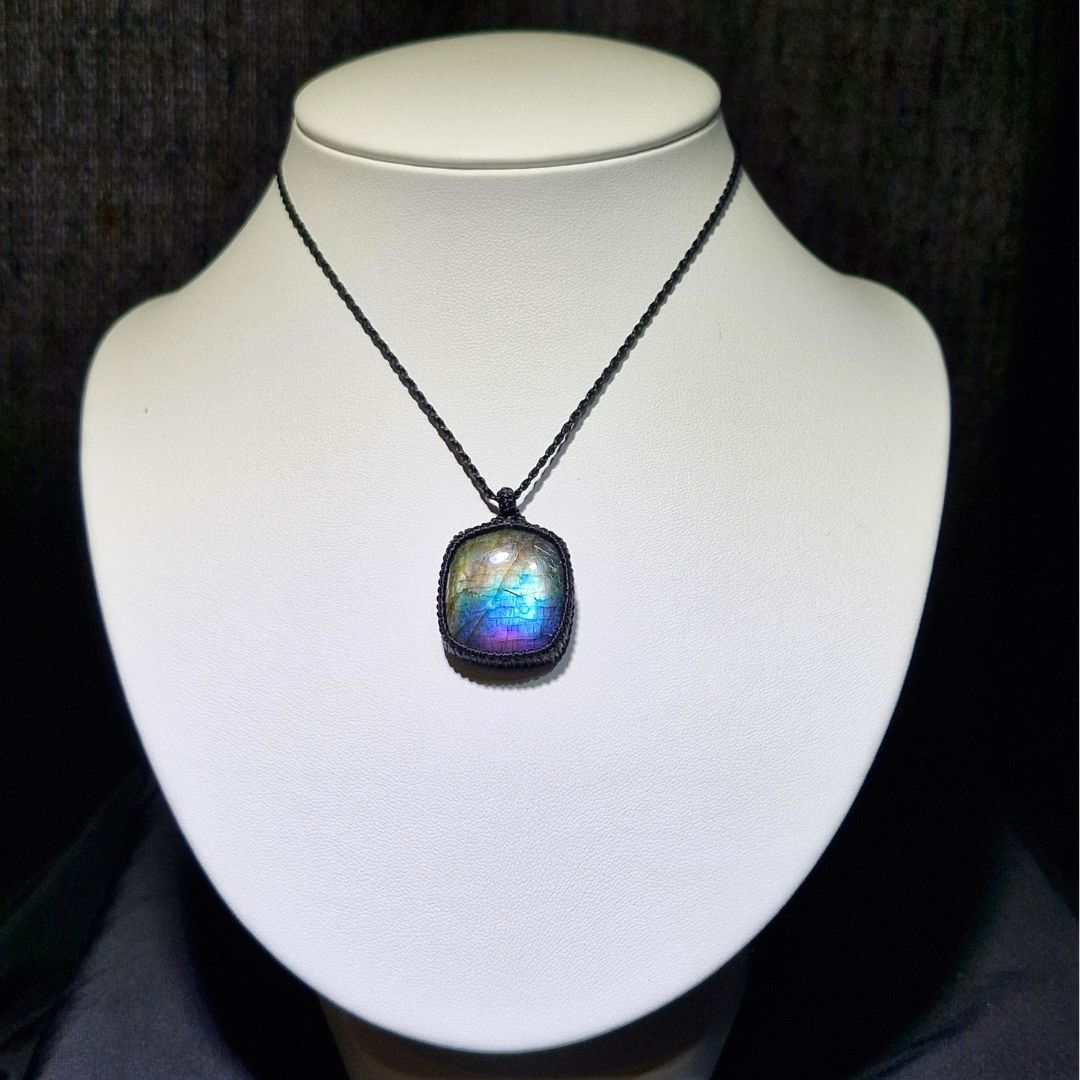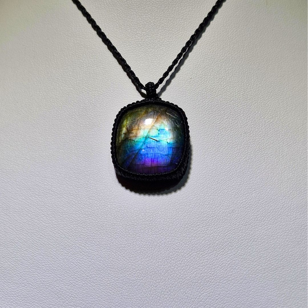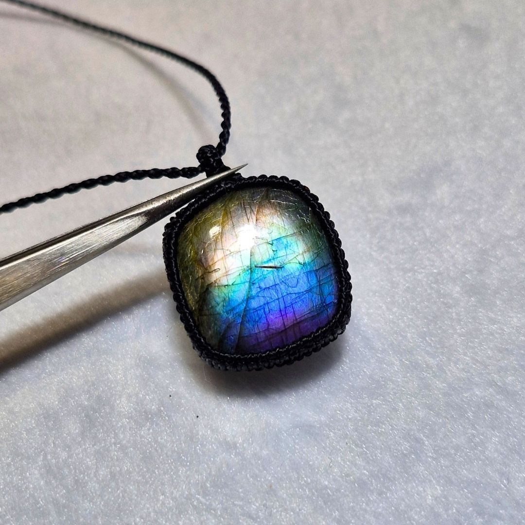 輝くラブラドライトを使用したこの美しいマクラメペンダントは、