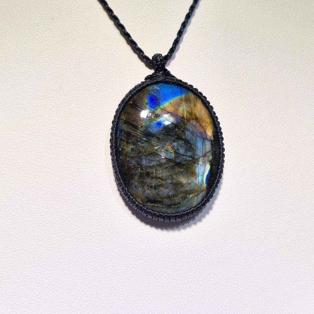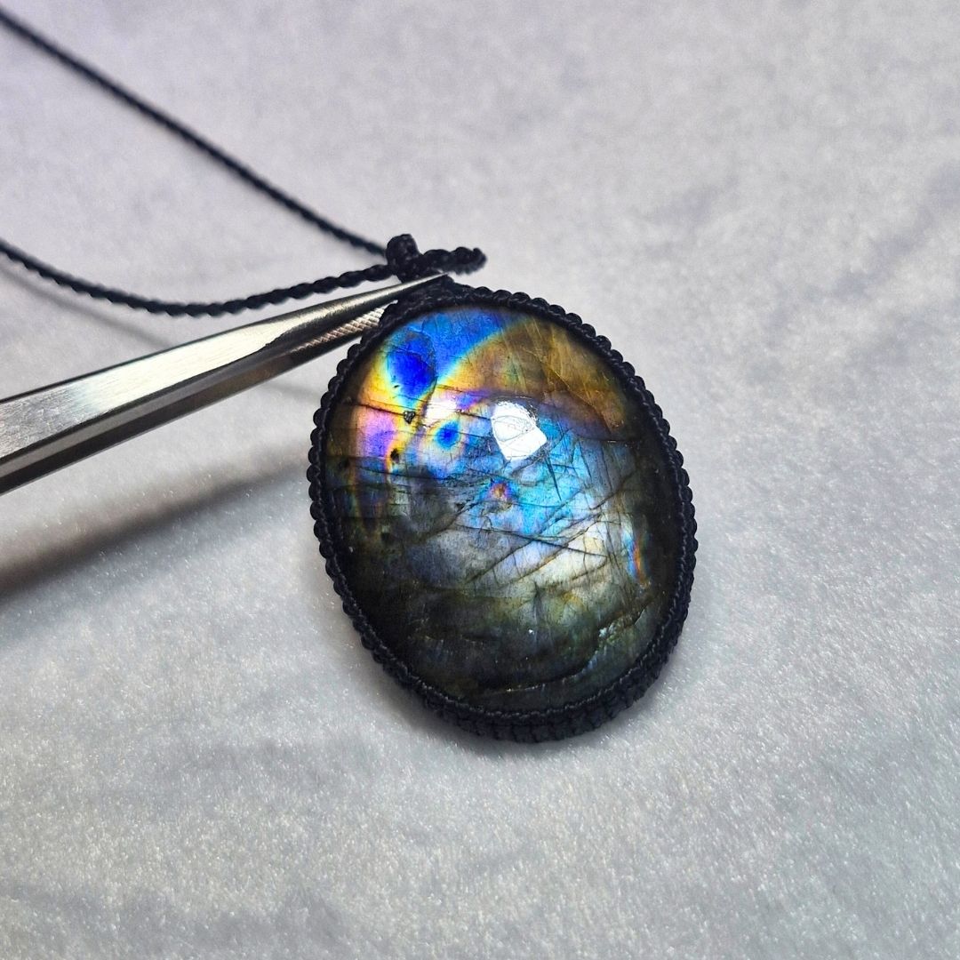 輝くラブラドライトを使用したこの美しいマクラメペンダントは、