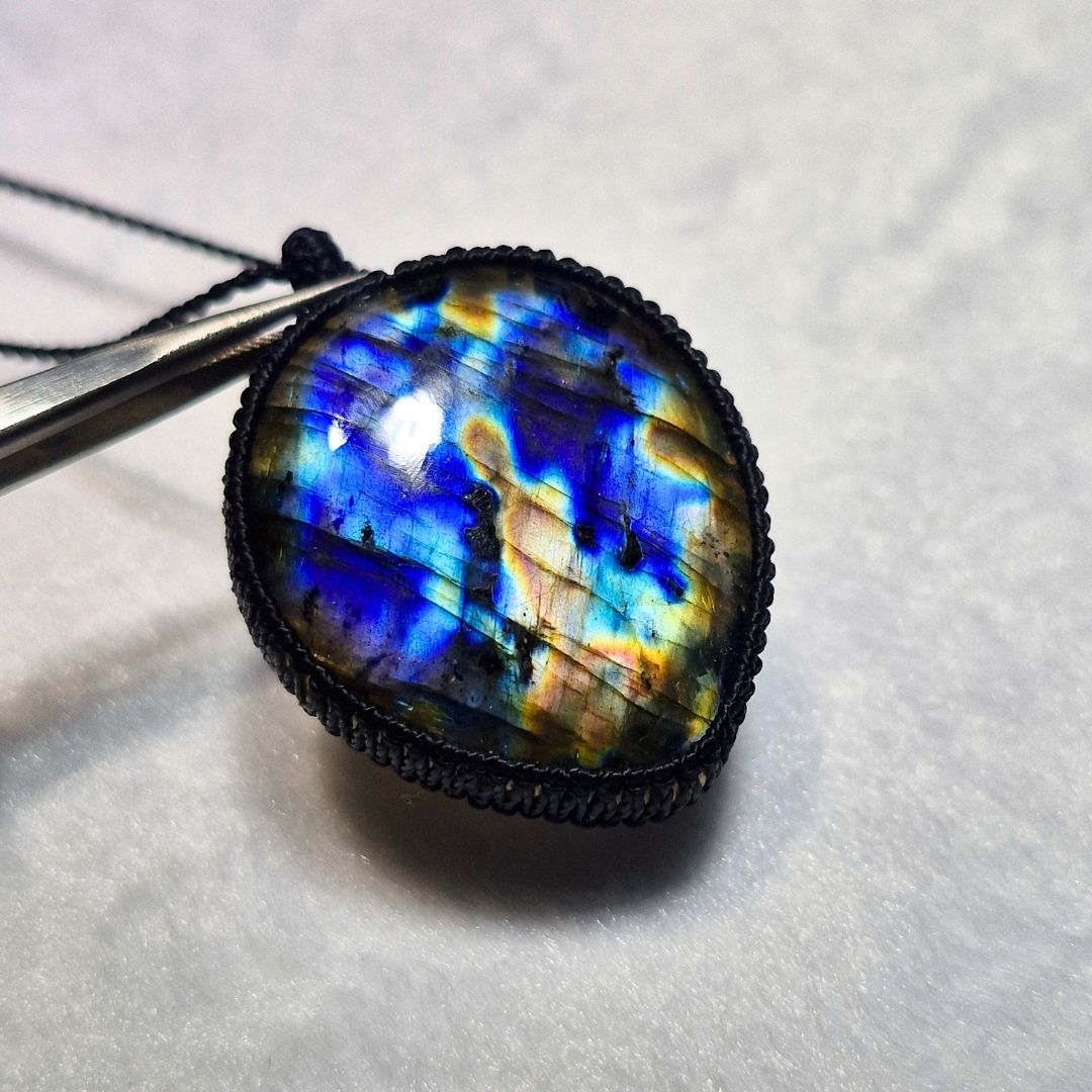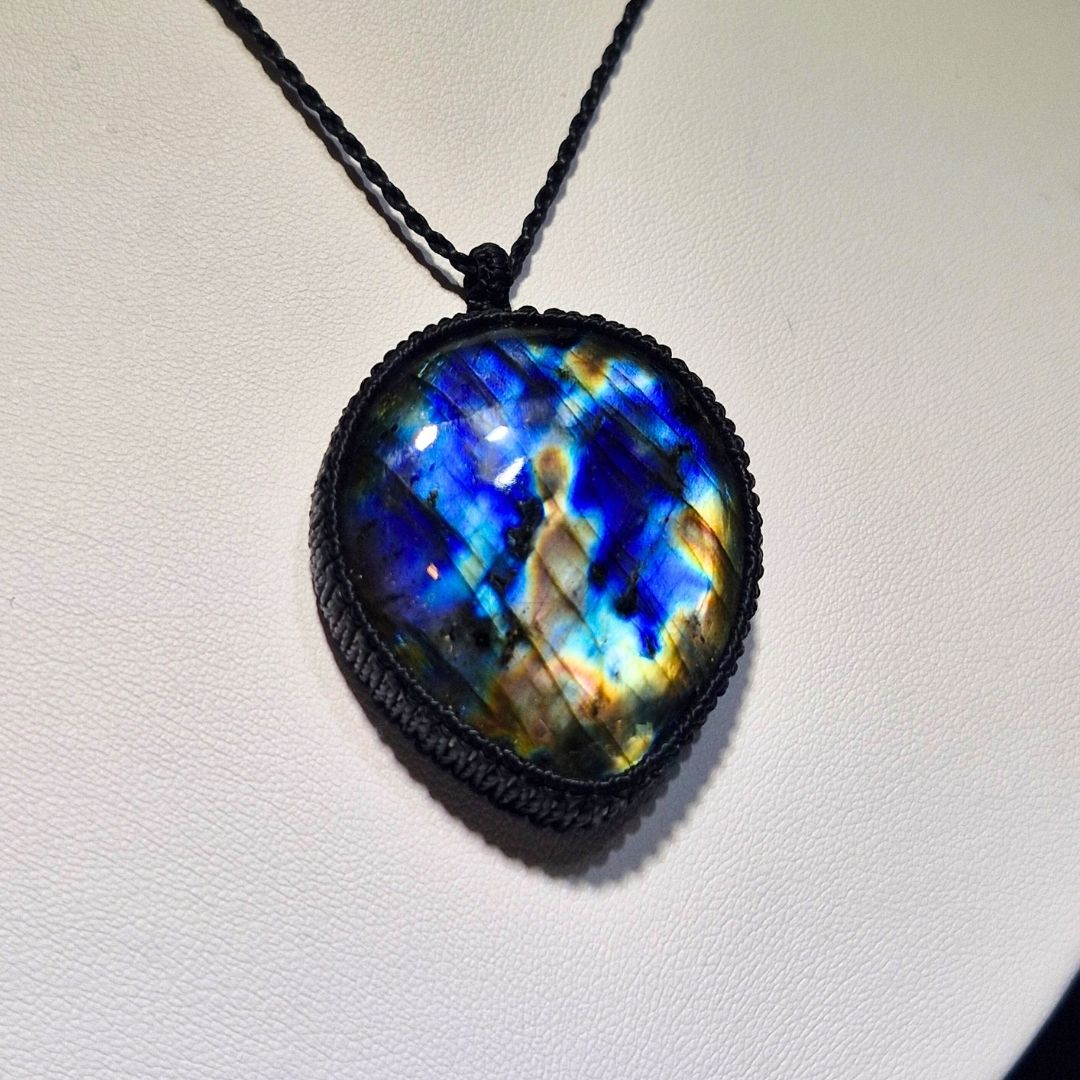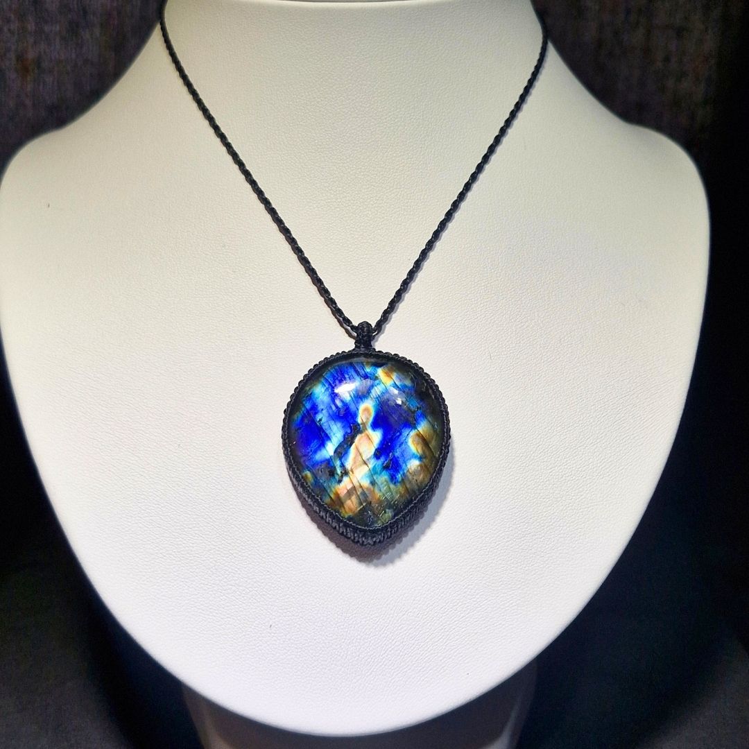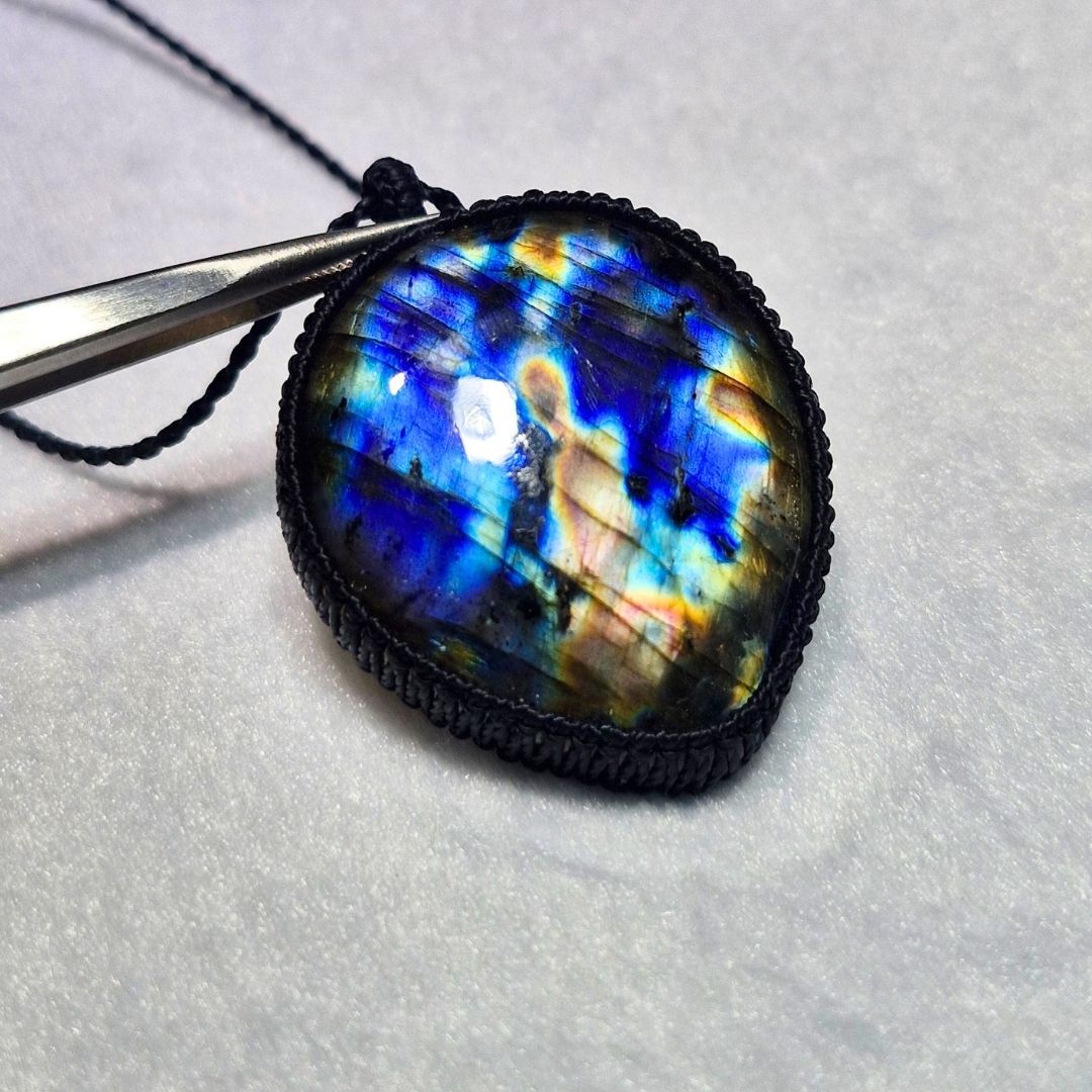 輝くラブラドライトを使用したこの美しいマクラメペンダントは、