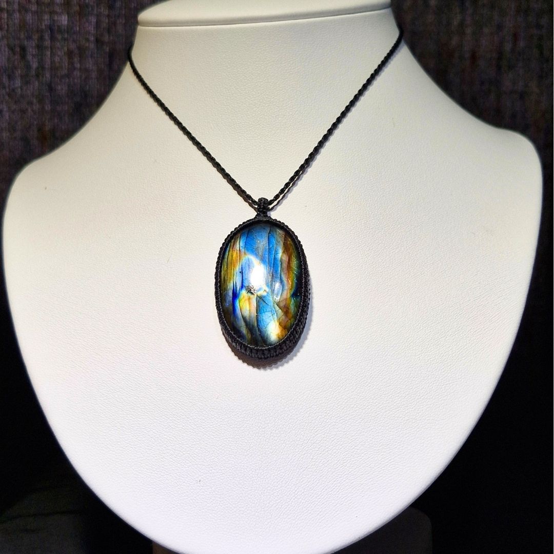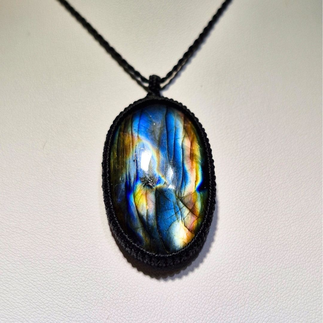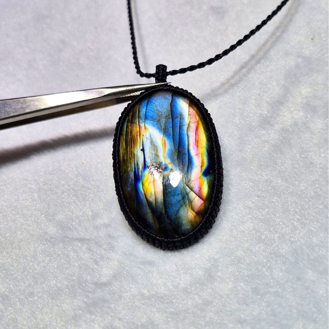 輝くラブラドライトを使用したこの美しいマクラメペンダントは、