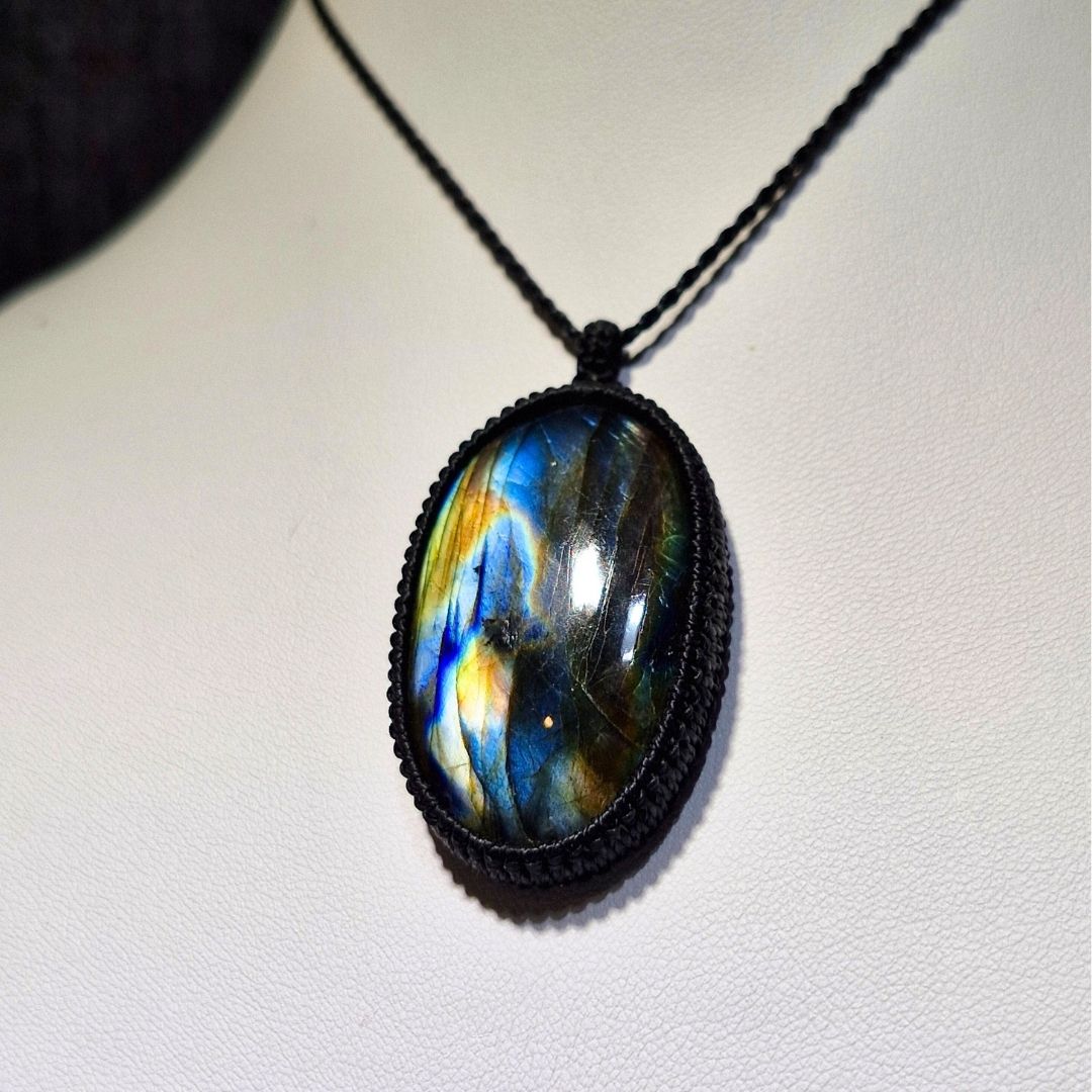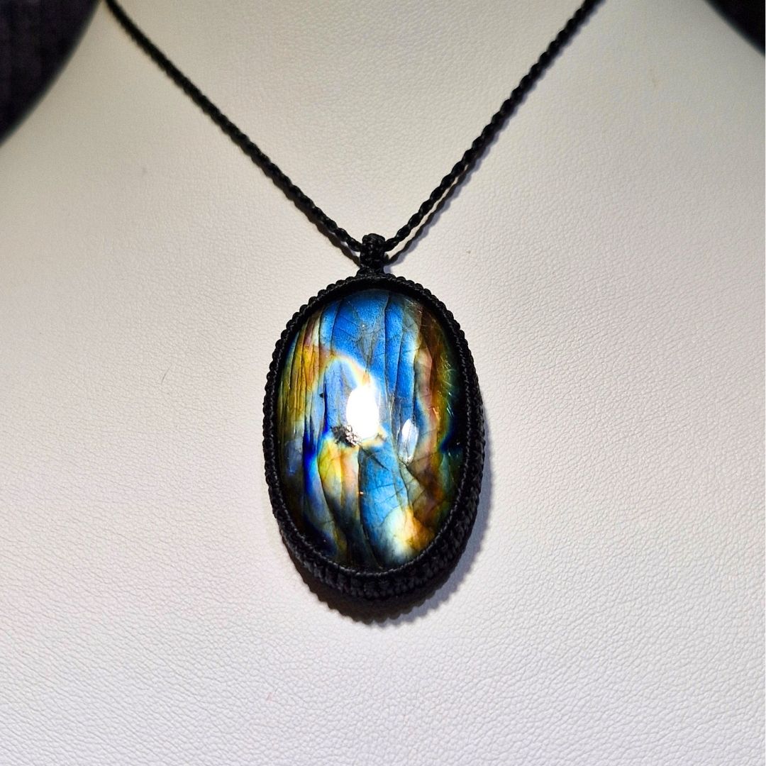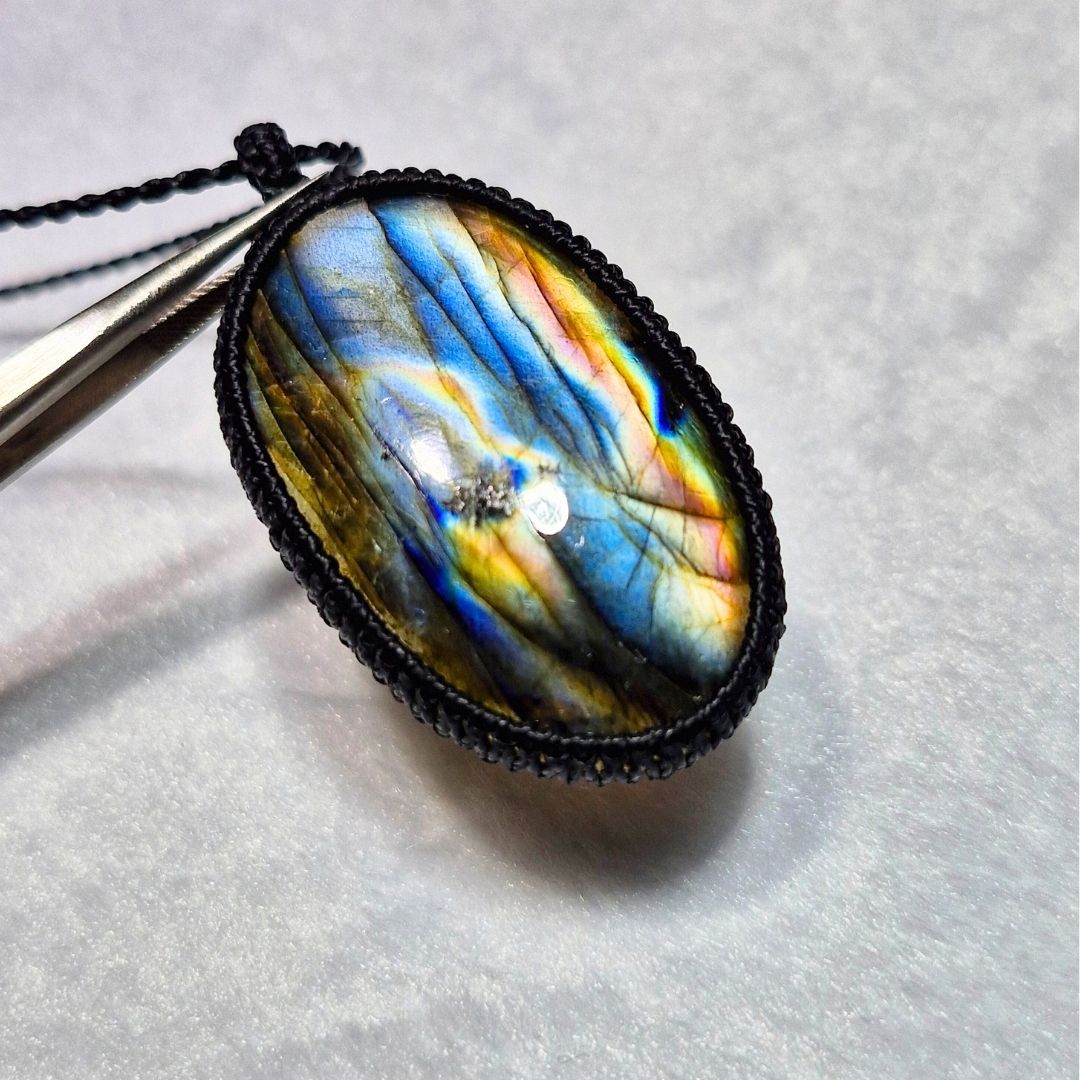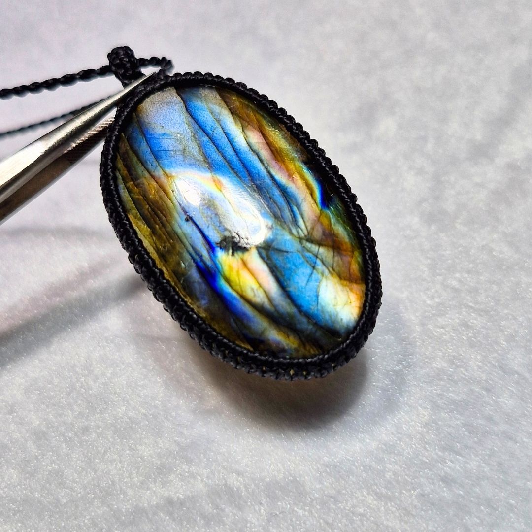 輝くラブラドライトを使用したこの美しいマクラメペンダントは、