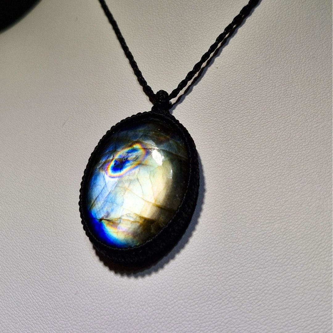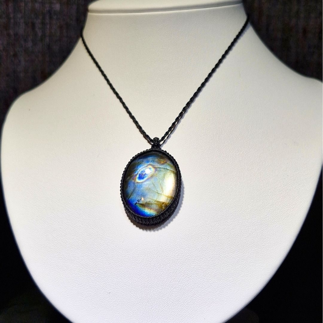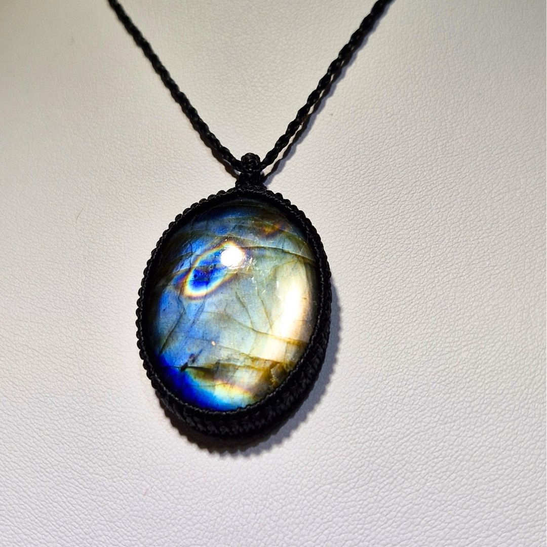 輝くラブラドライトを使用したこの美しいマクラメペンダントは、