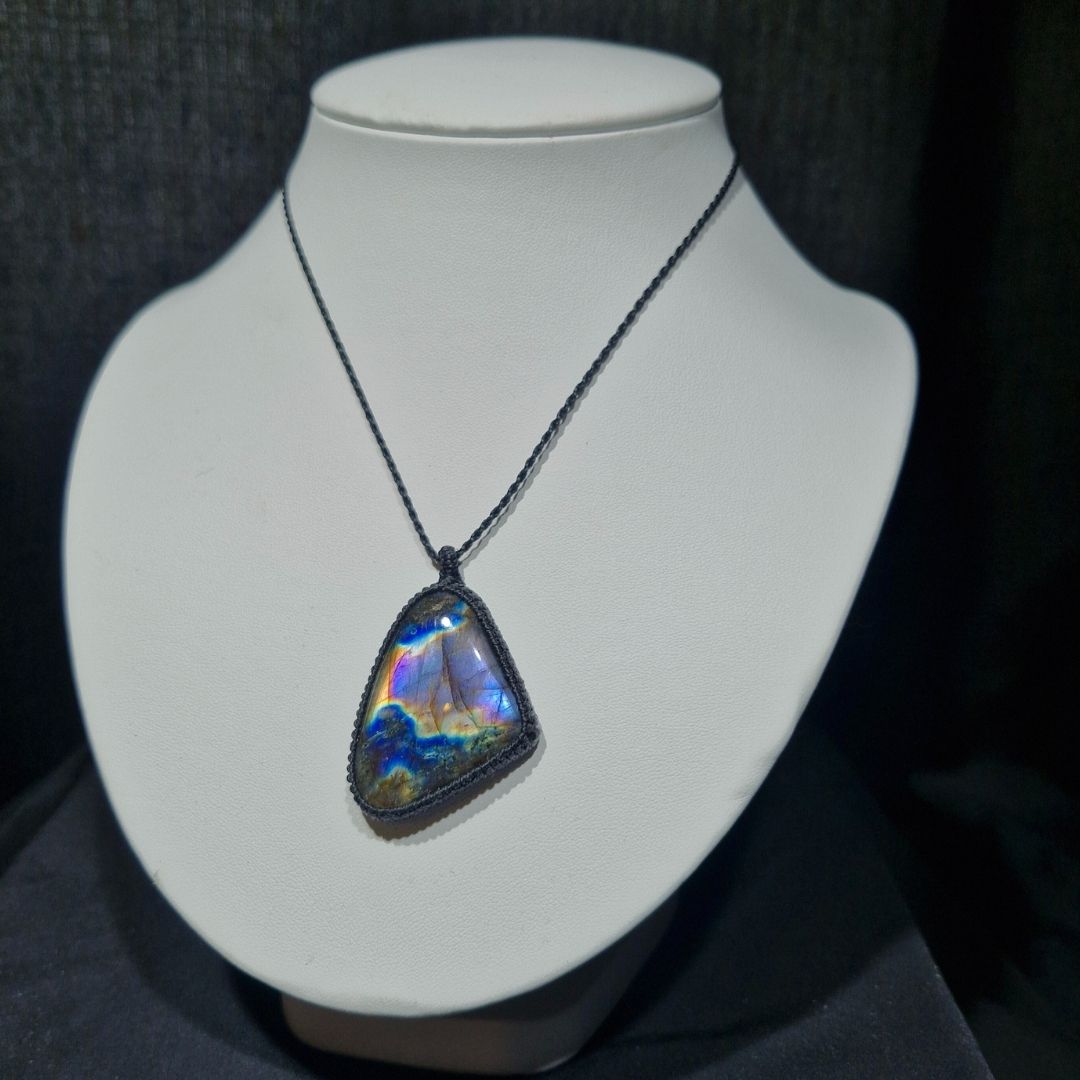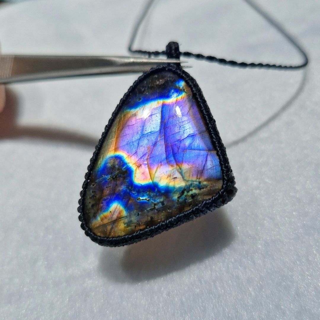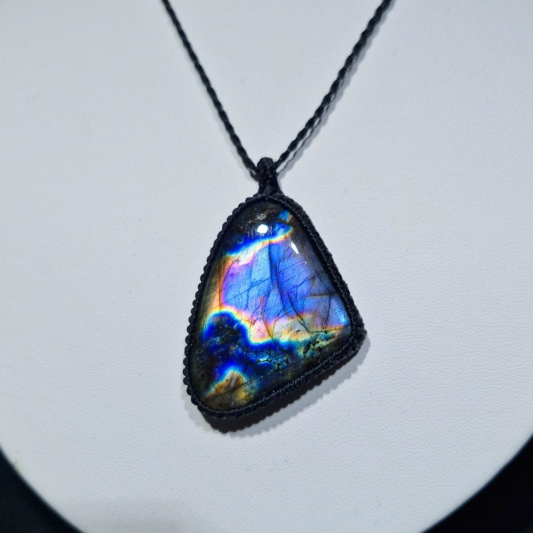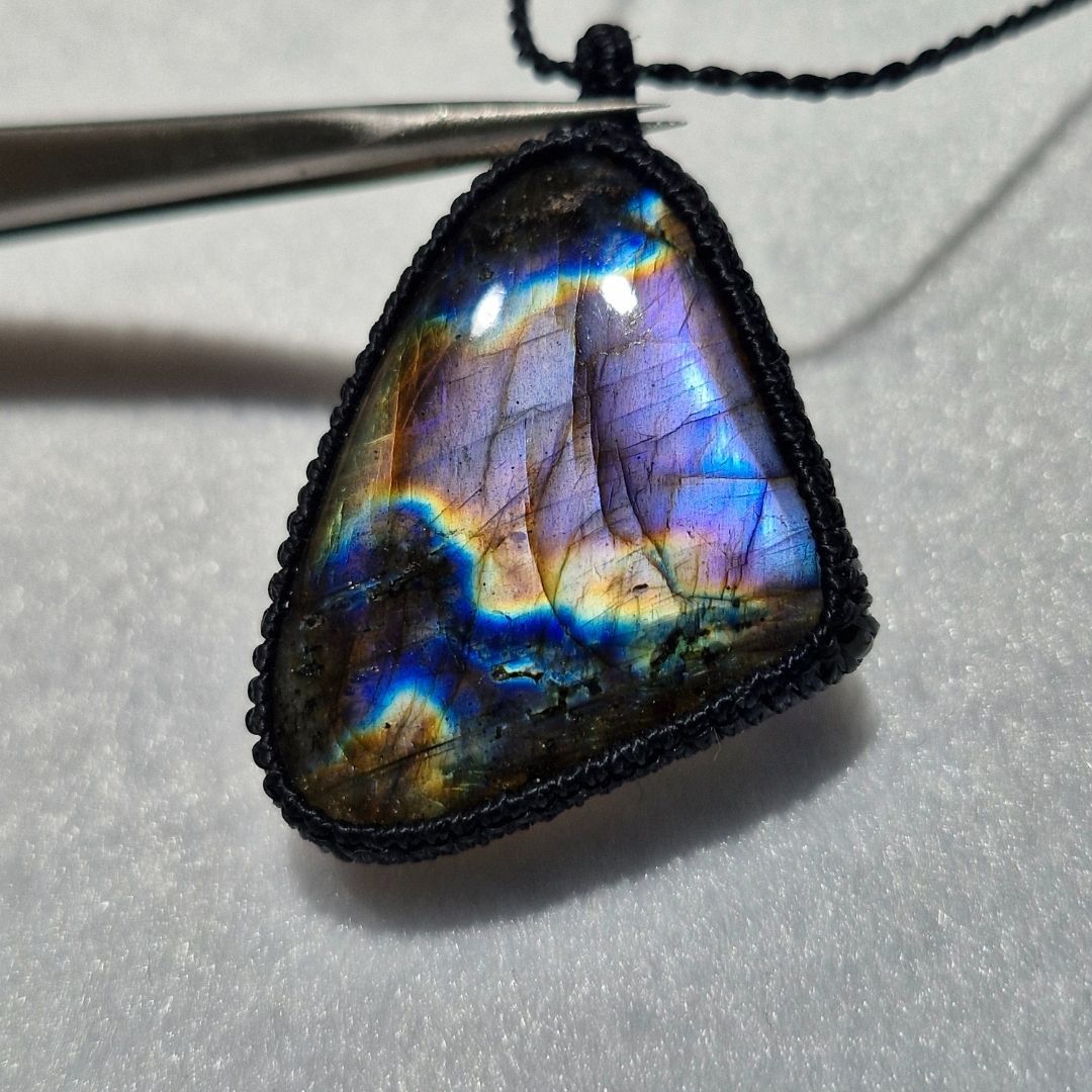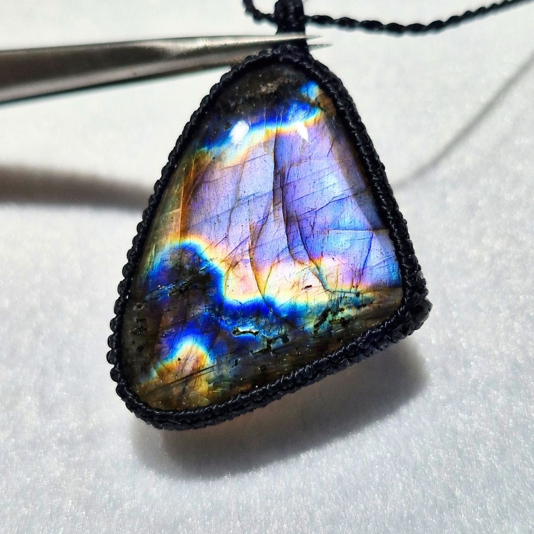 輝くラブラドライトを使用したこの美しいマクラメペンダントは、
