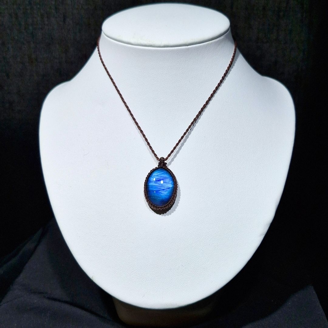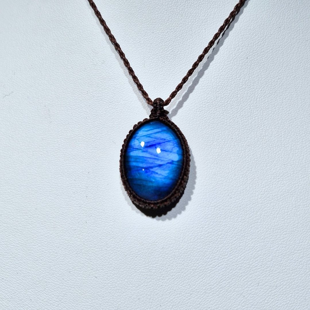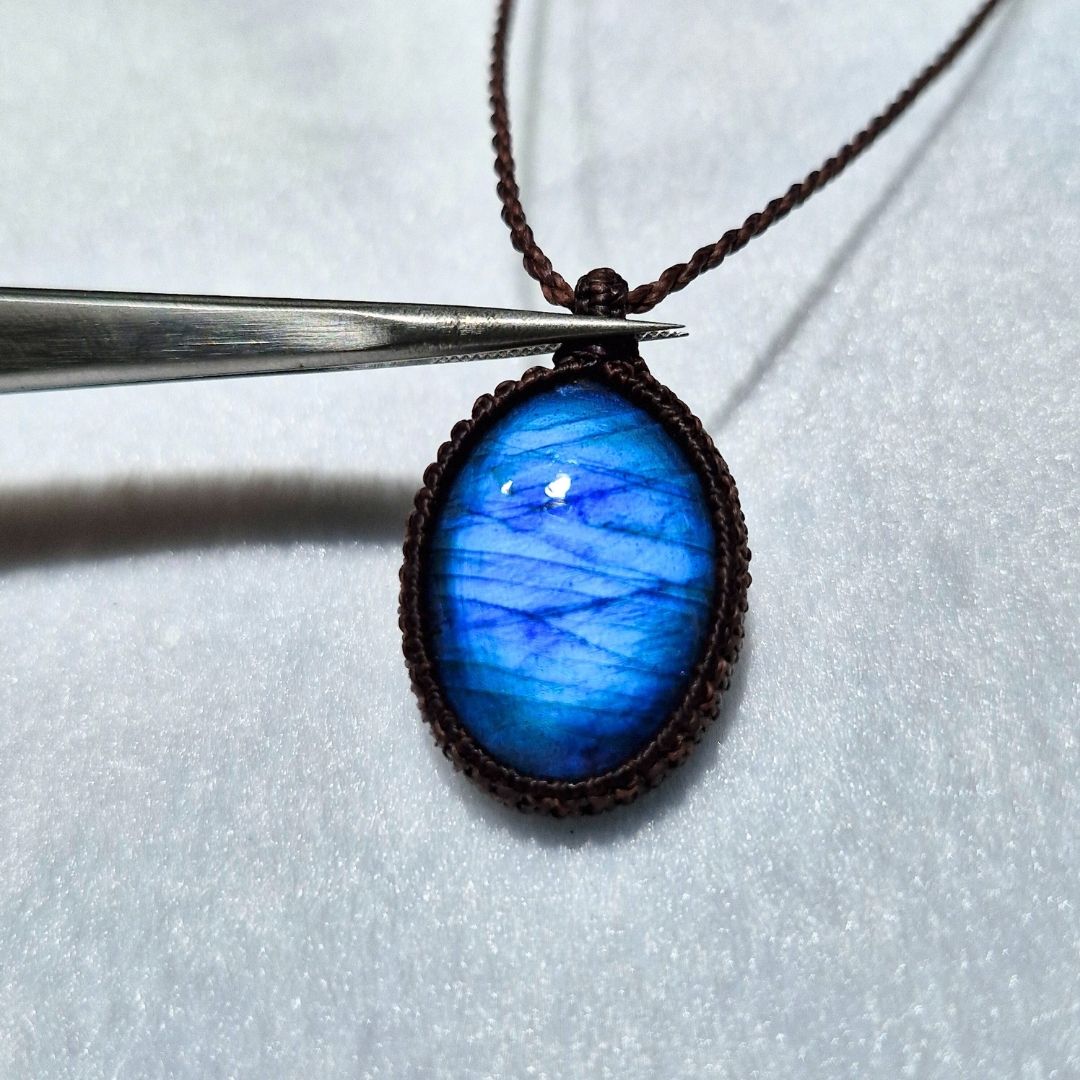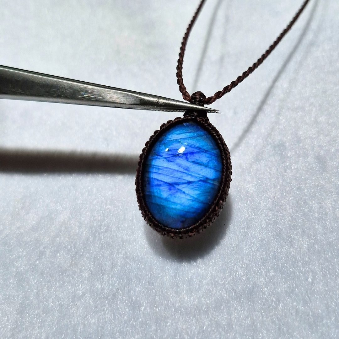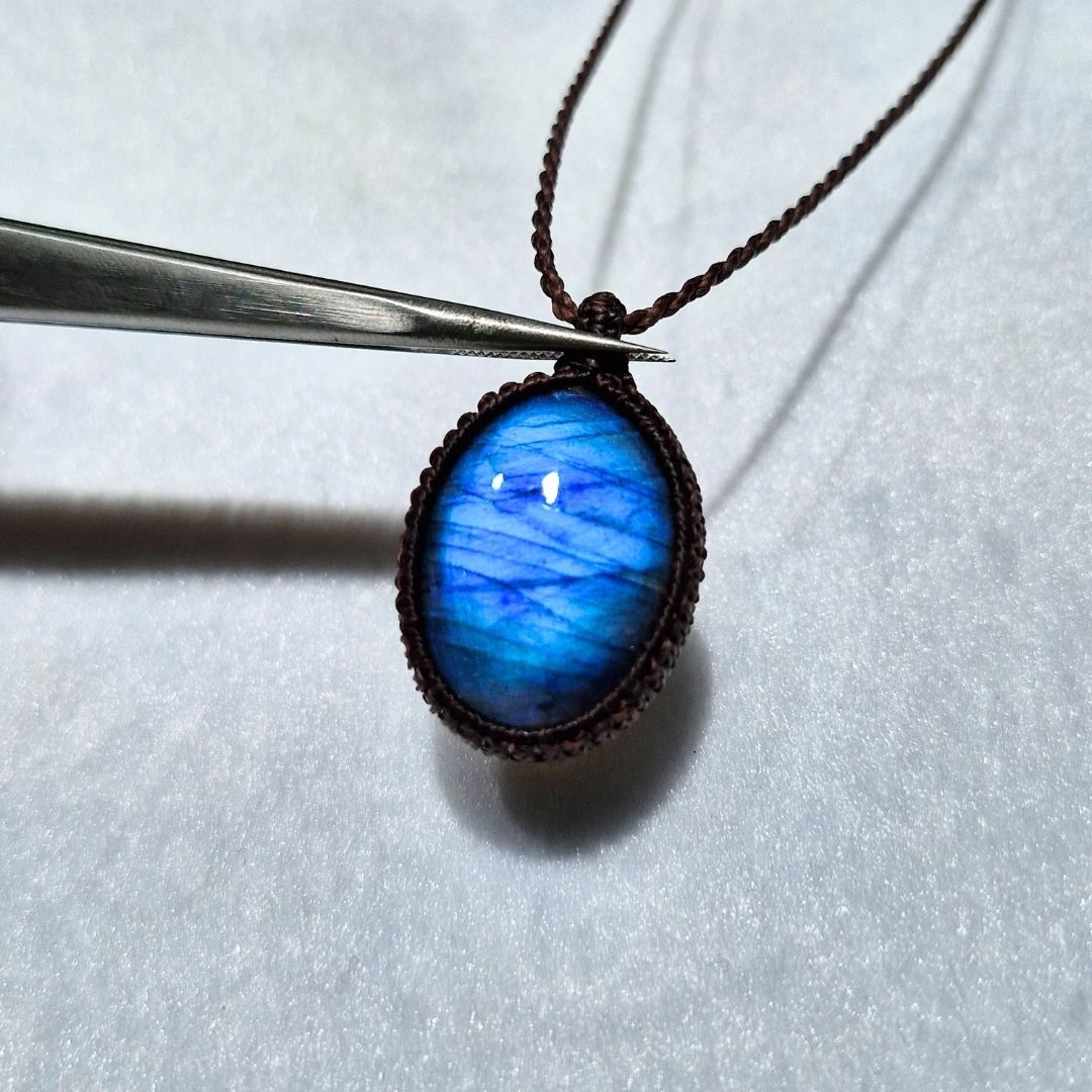 輝くラブラドライトを使用したこの美しいマクラメペンダントは、