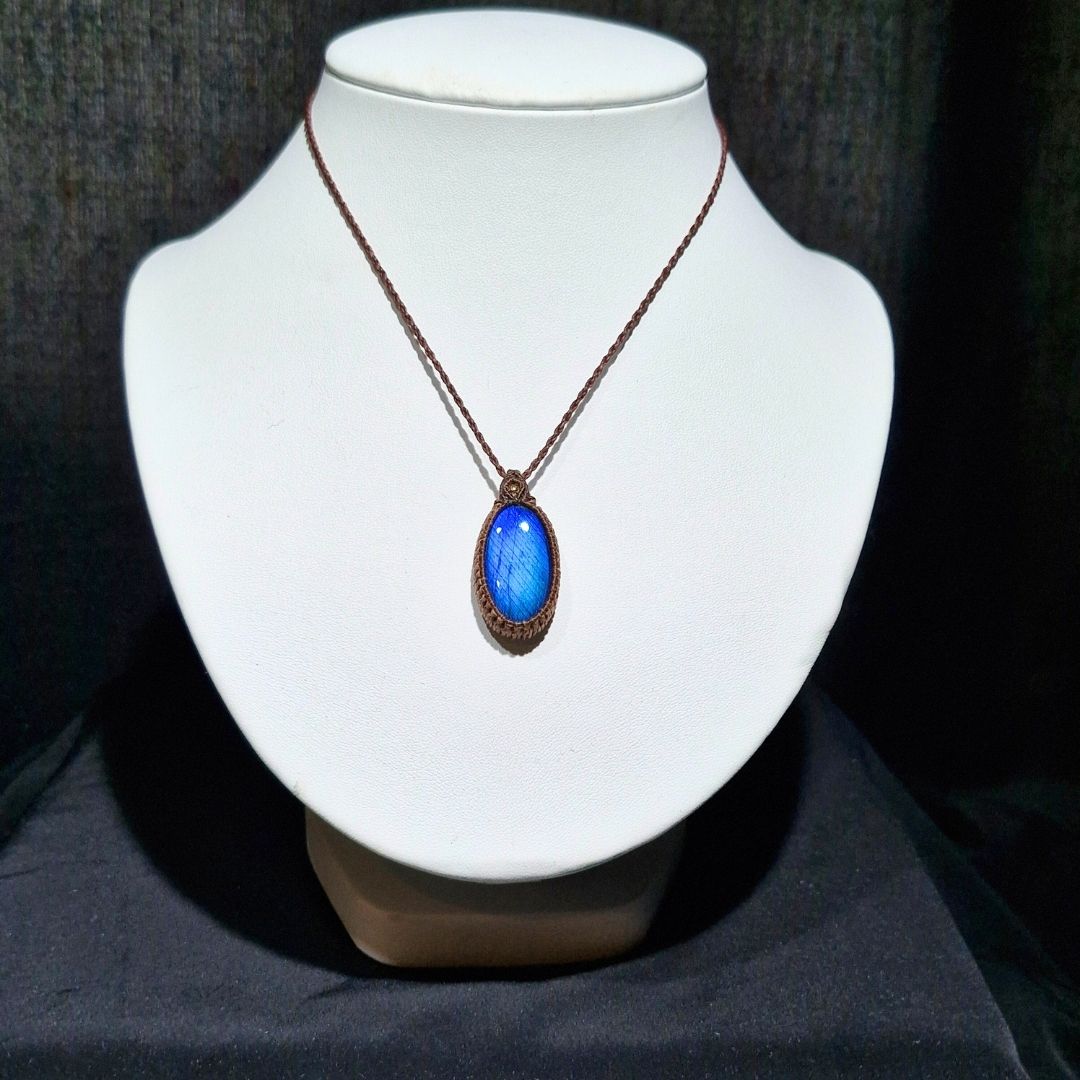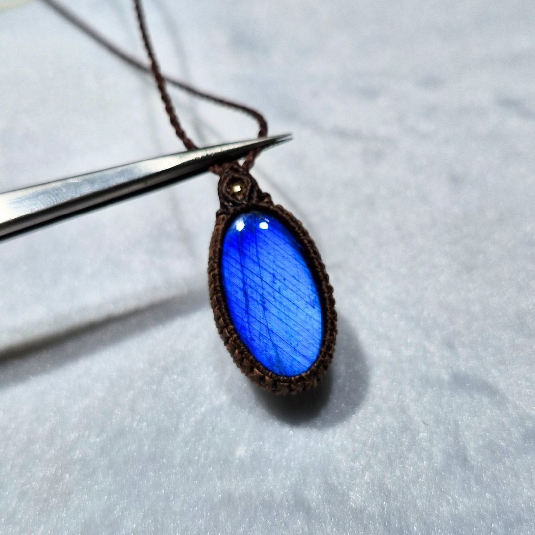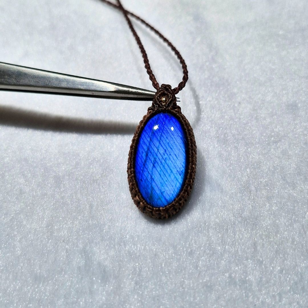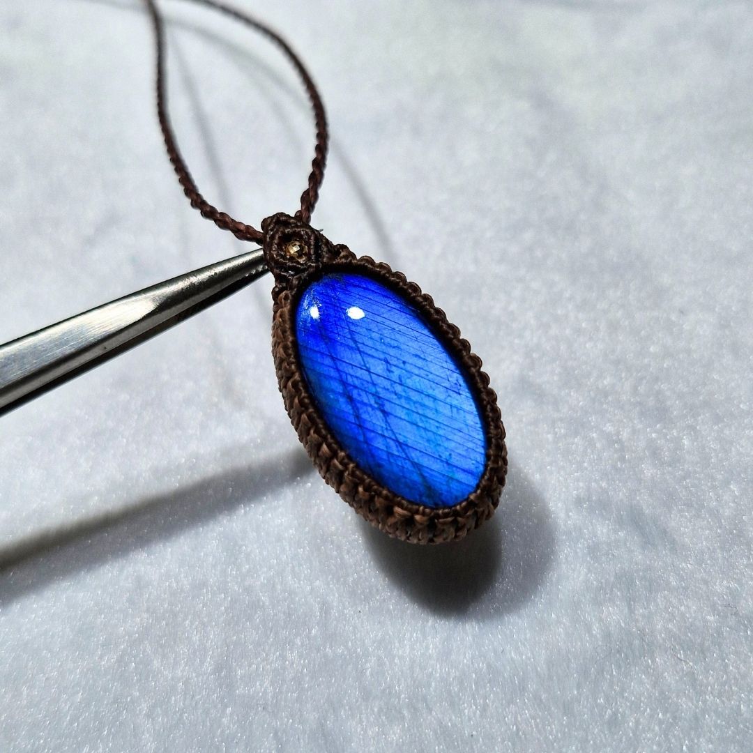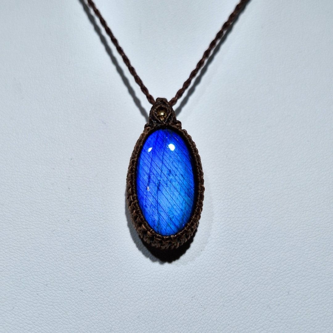輝くラブラドライトを使用したこの美しいマクラメペンダントは、