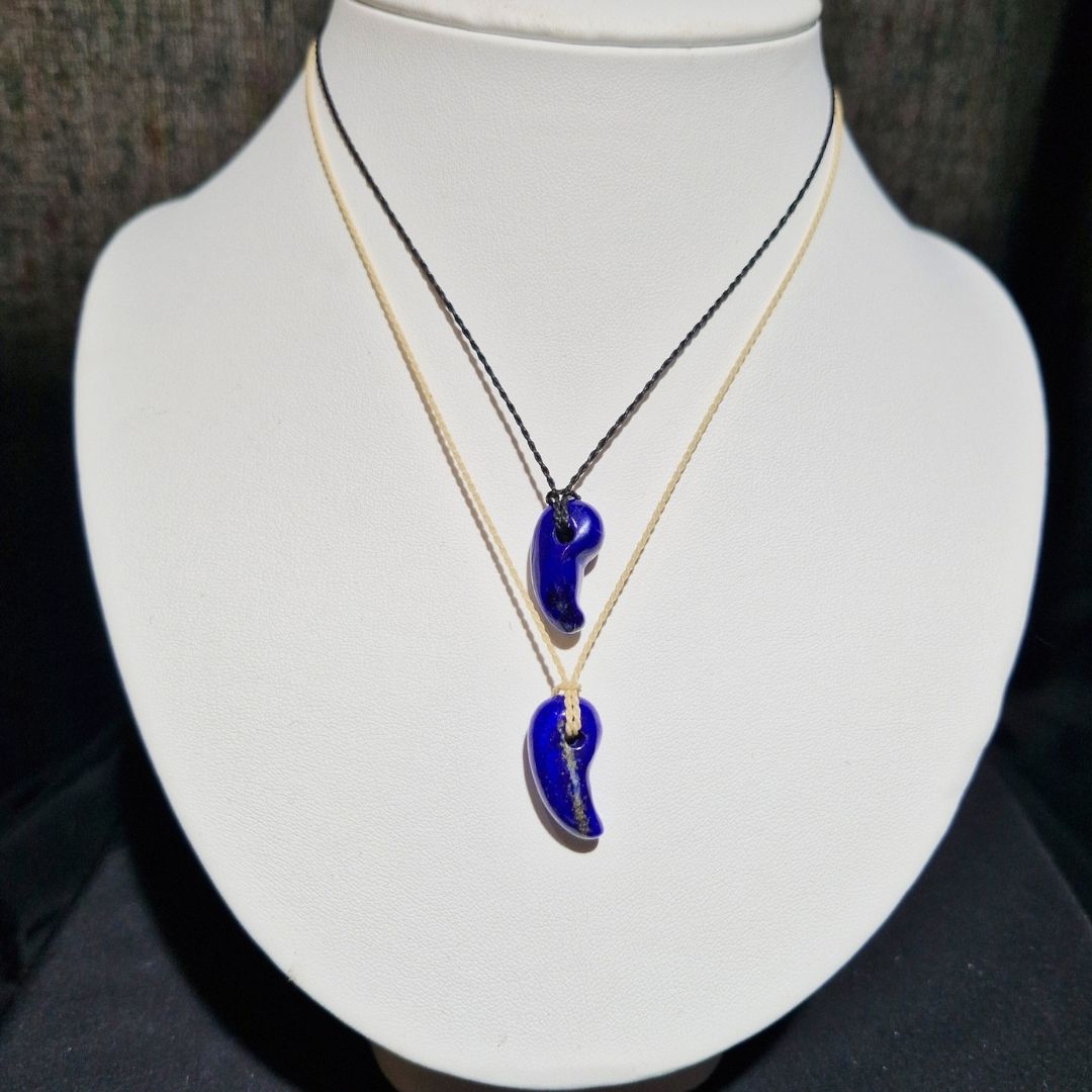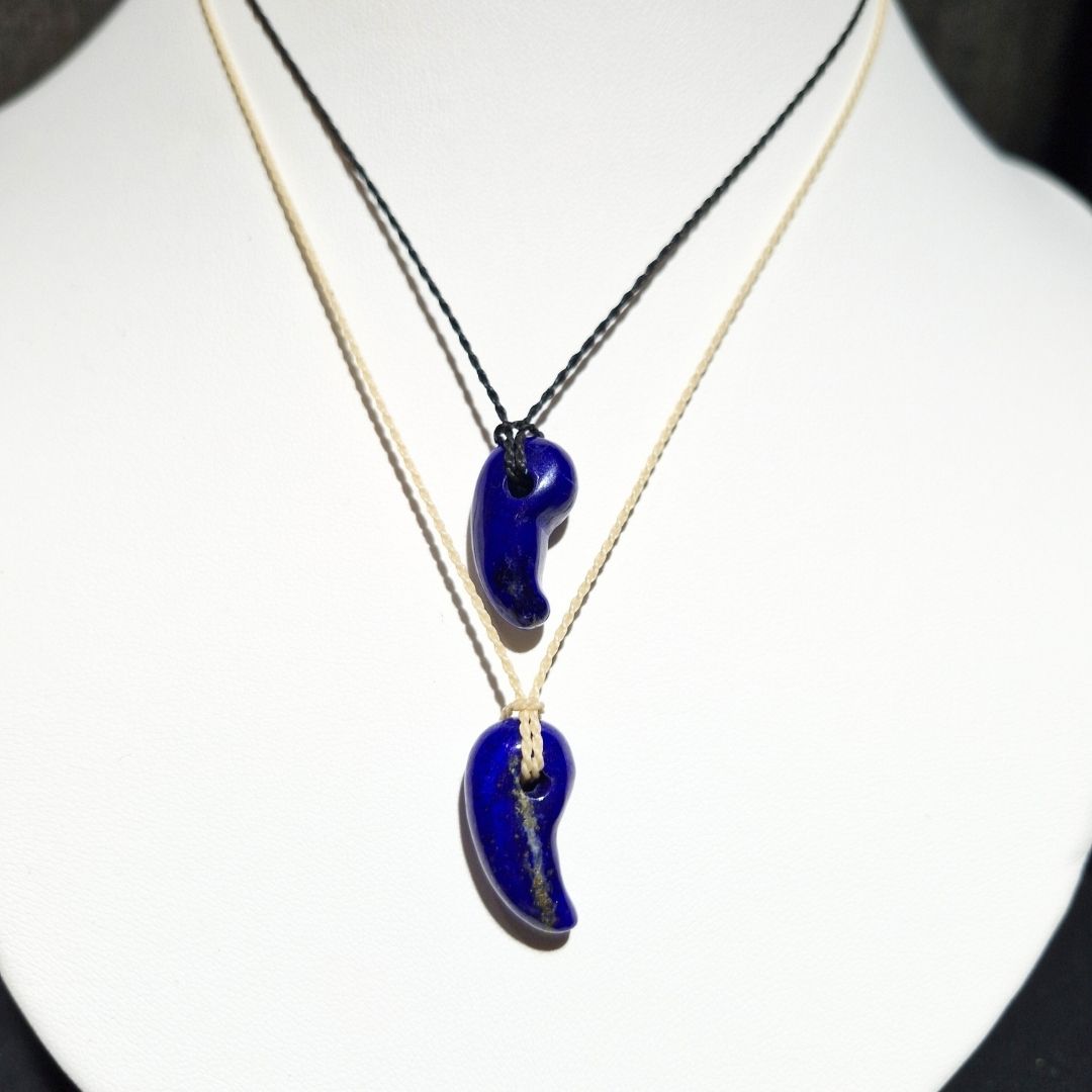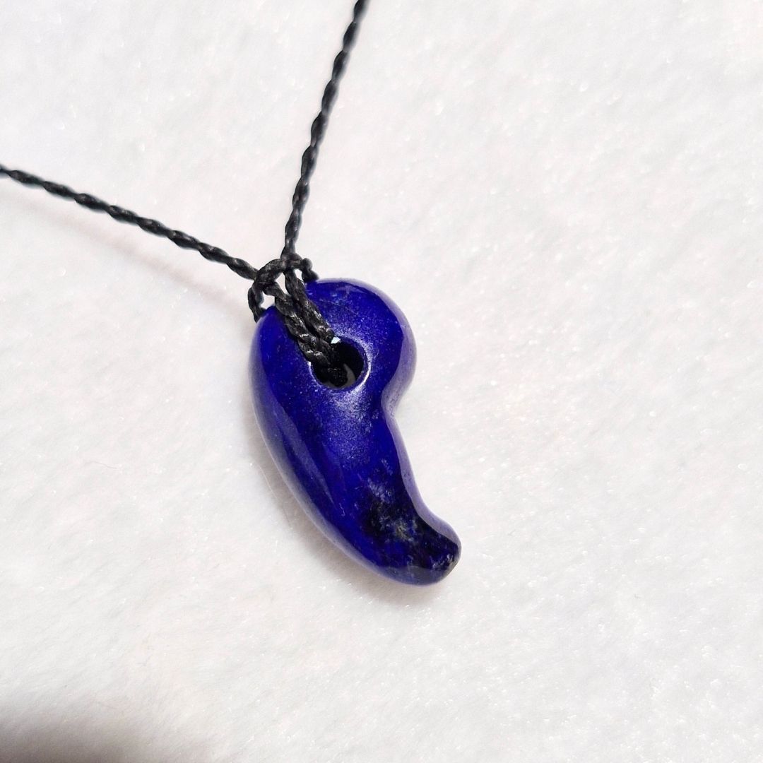 深い青に金の煌めきを宿すラピスラズリの勾玉は、