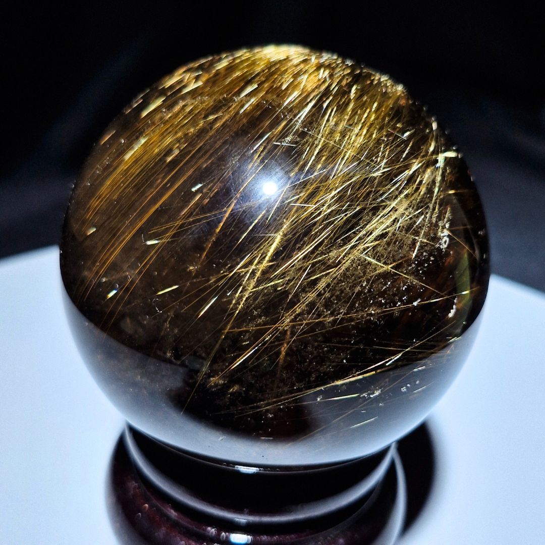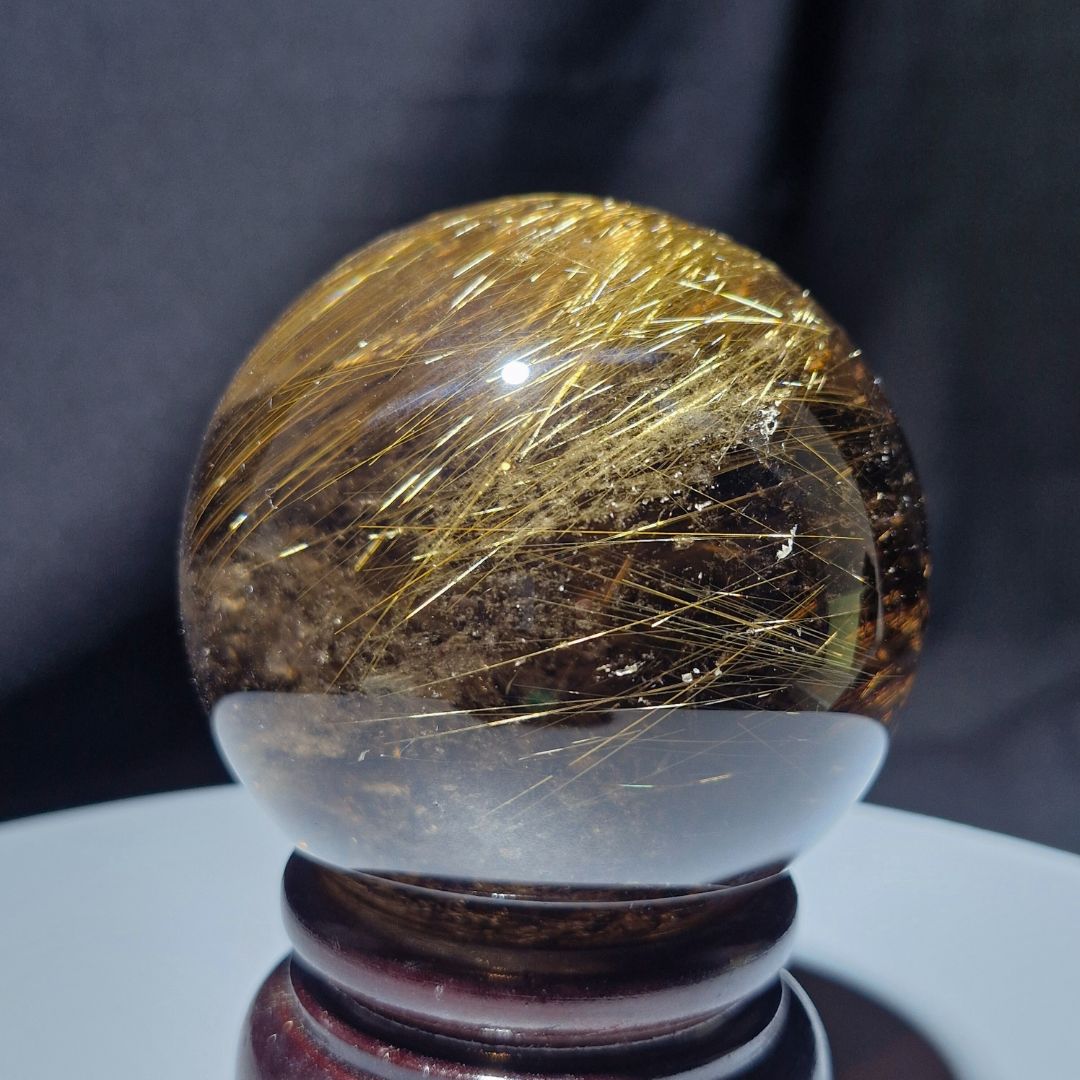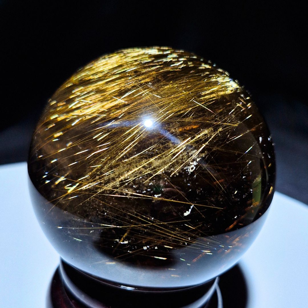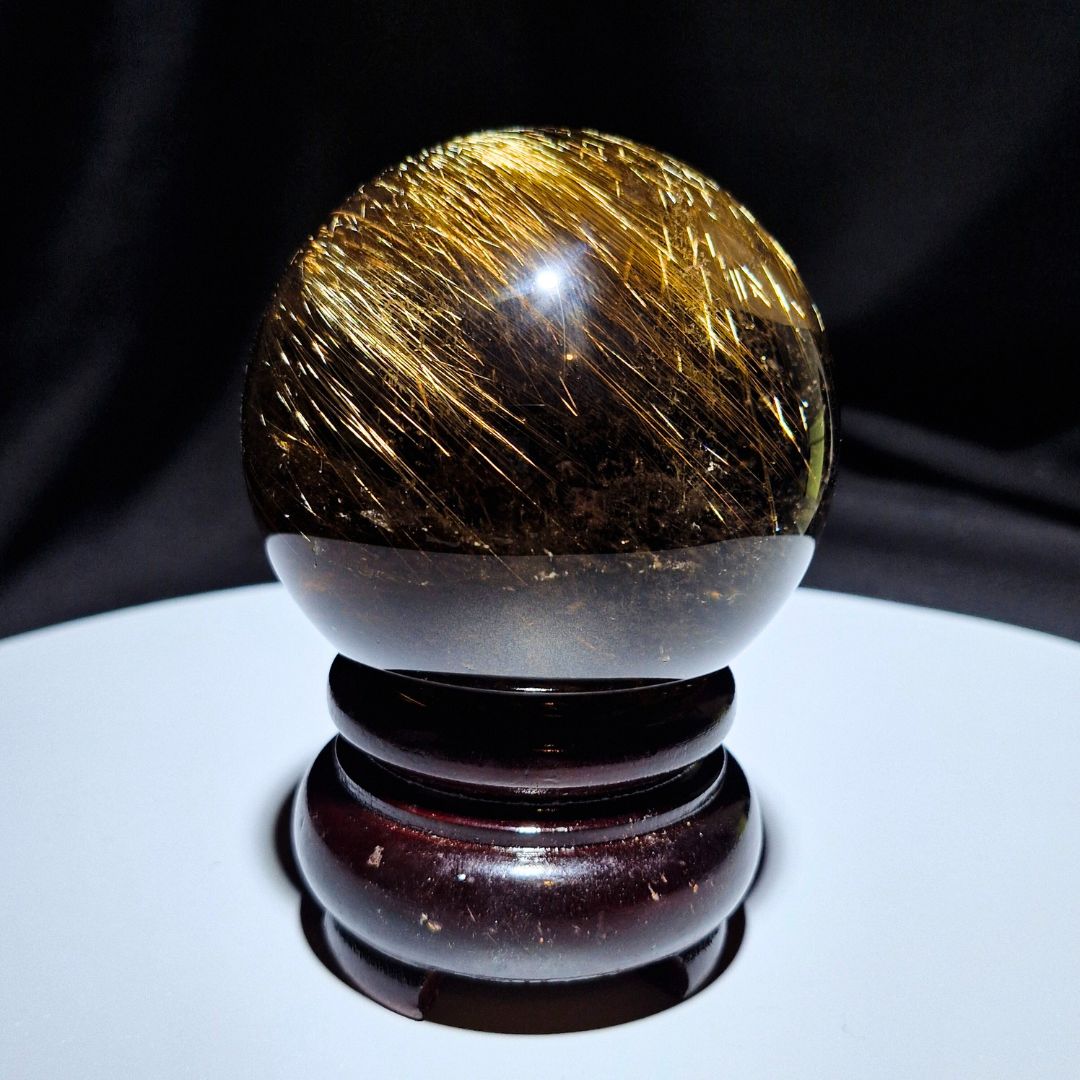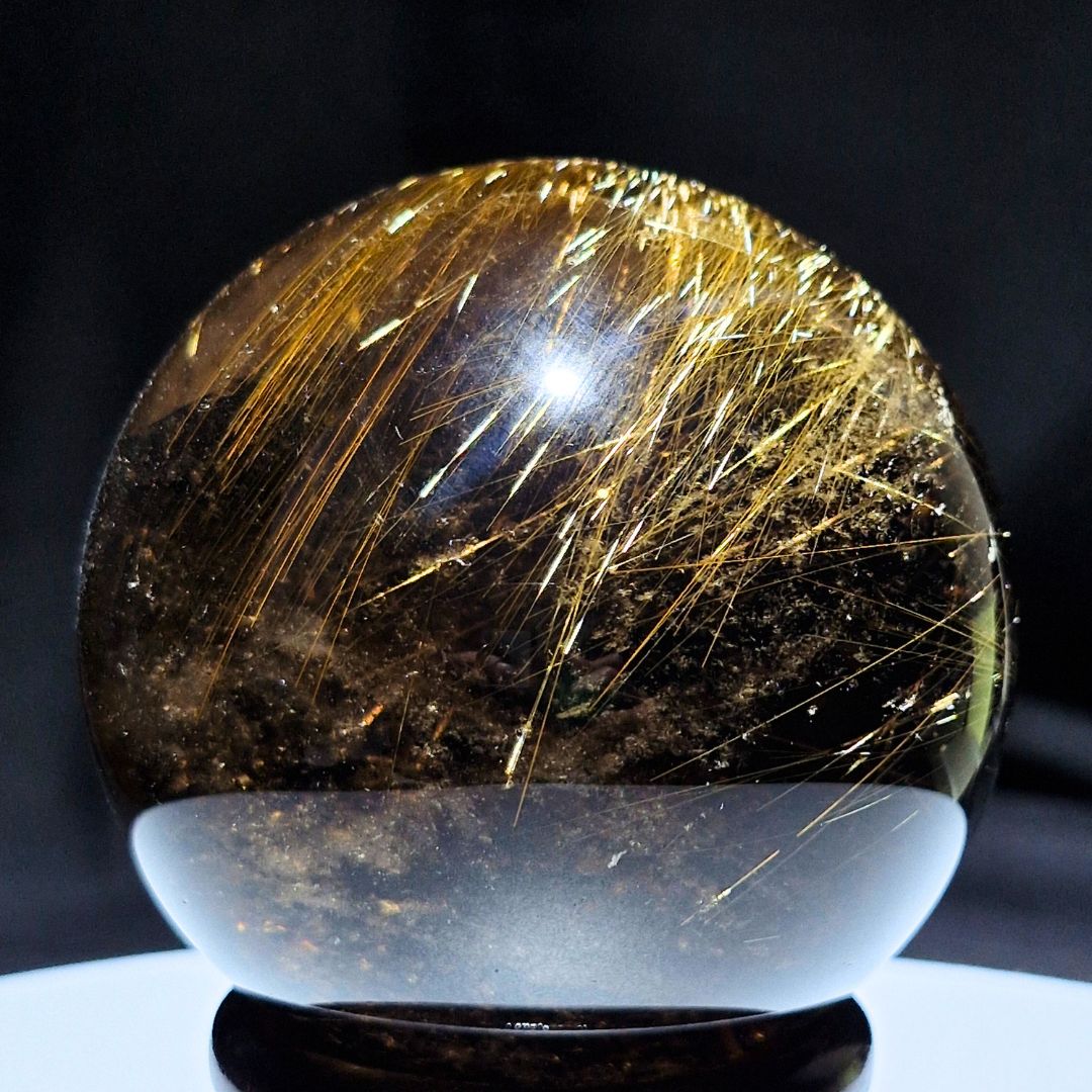 ☆12/03UP☆月のかけら史上最高峰:ゴールドスモーキールチルクォーツ;コレクションピースを大放出:丸玉加工:金の流星:漆黒の守り(しっこくのまもり) [R7-12-04]