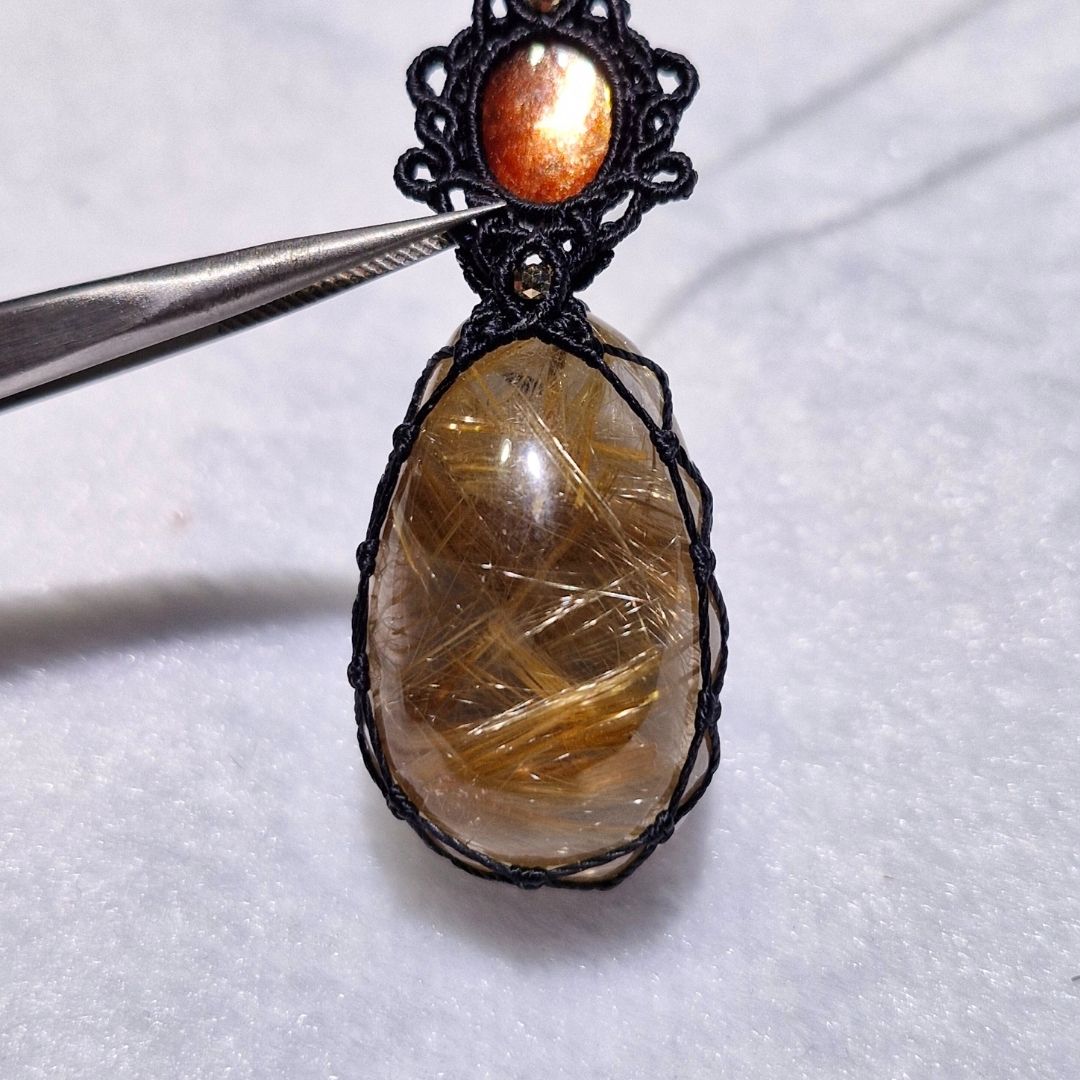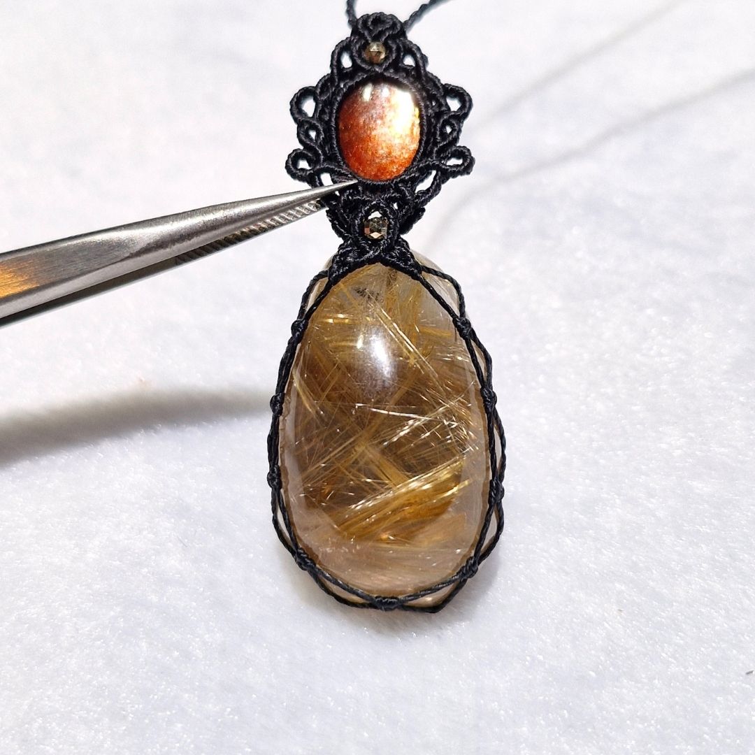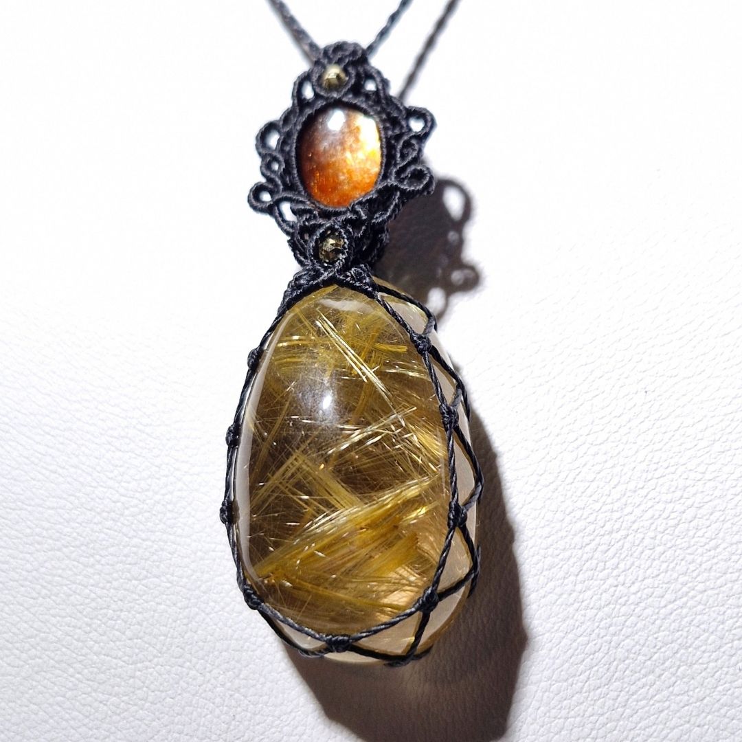 ☆11/05UP☆先生作品マイクロマクラメジュエリー:ブラジル産ゴールドルチルクォーツ!金の針金が水晶の中に:美しい金の結晶:Sun Threads Amulet(サンスレッズ・アミュレット) [R7-12-05]