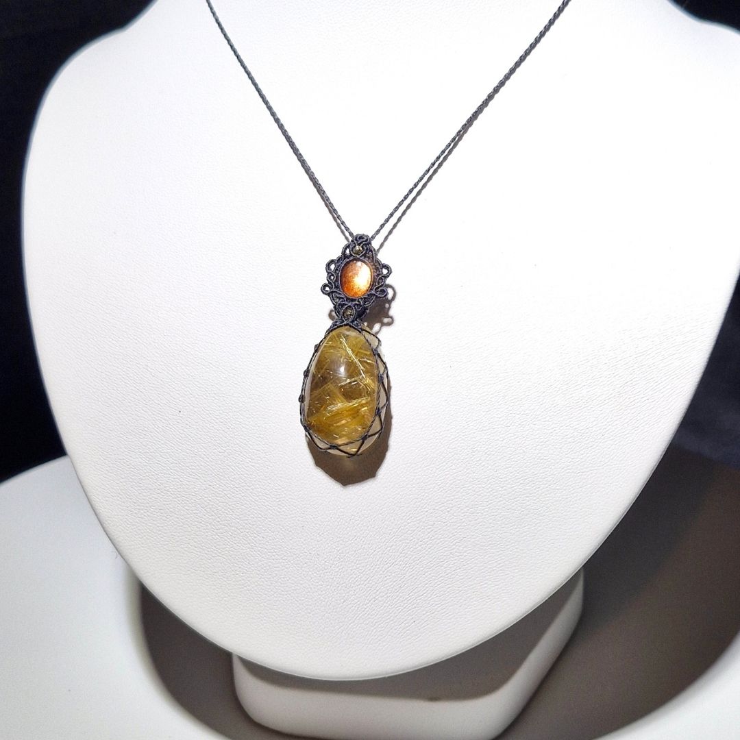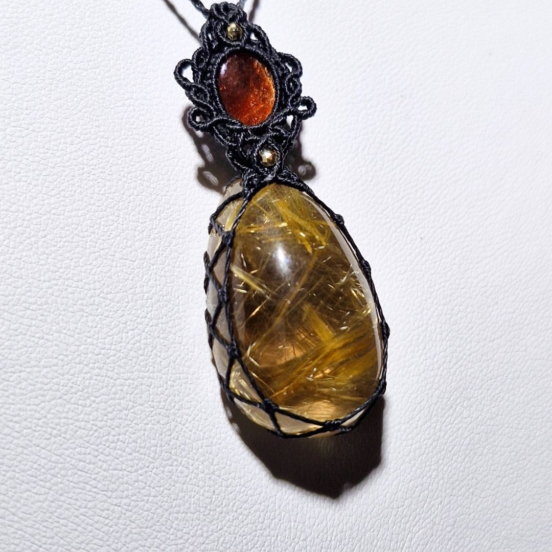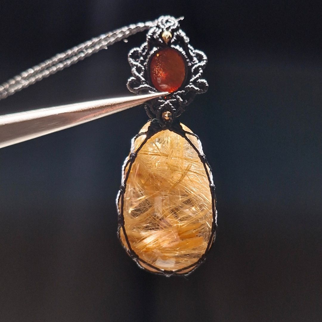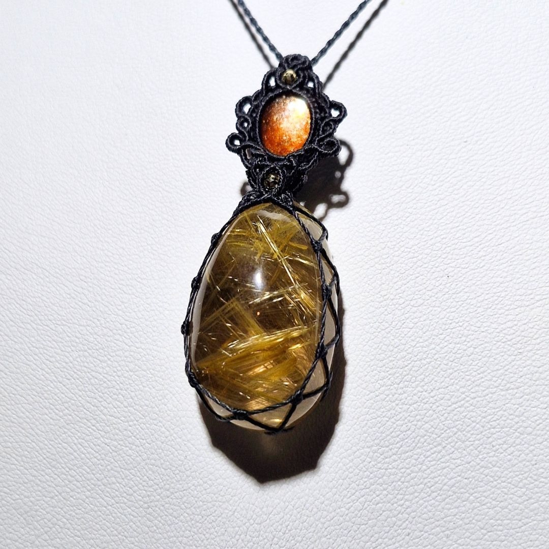 ☆11/05UP☆先生作品マイクロマクラメジュエリー:ブラジル産ゴールドルチルクォーツ!金の針金が水晶の中に:美しい金の結晶:Sun Threads Amulet(サンスレッズ・アミュレット) [R7-12-05]