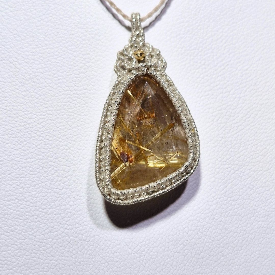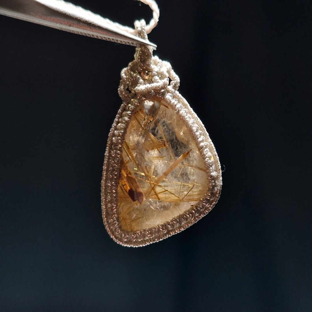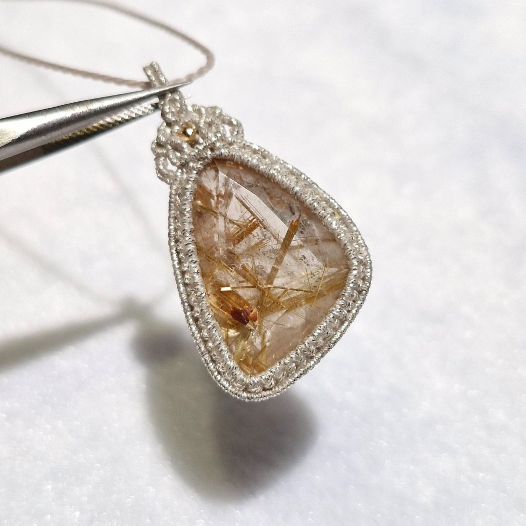 ☆11/05UP☆先生作品マイクロマクラメジュエリー:ブラジル産ゴールドルチルクォーツ!金の針金が水晶の中に:美しい金の結晶:Aurora Needle Quartz(オーロラニードル・クォーツ) [R7-12-06]