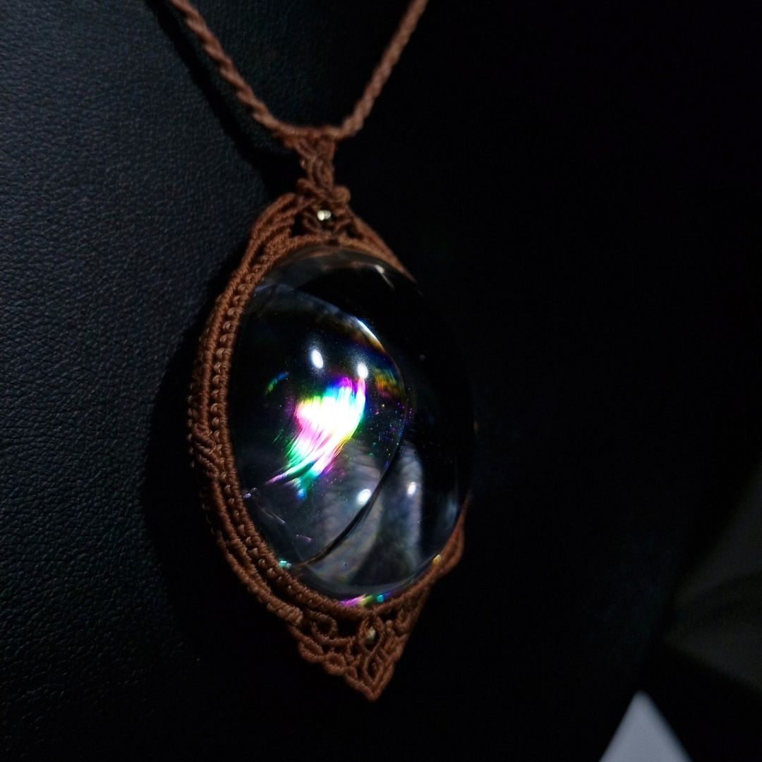 アイリスクォーツは、水晶の内部に自然に入ったクラック(割れ)が光を屈折させ、